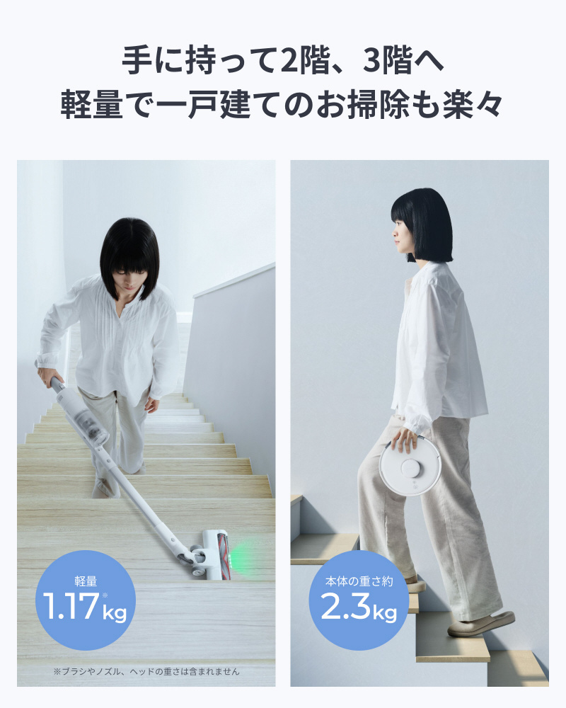 ロボットも2.3kgで、片手に持って2階、3階へ。一戸建てのお掃除でも楽々移動できてストレスなくお掃除いただけます。