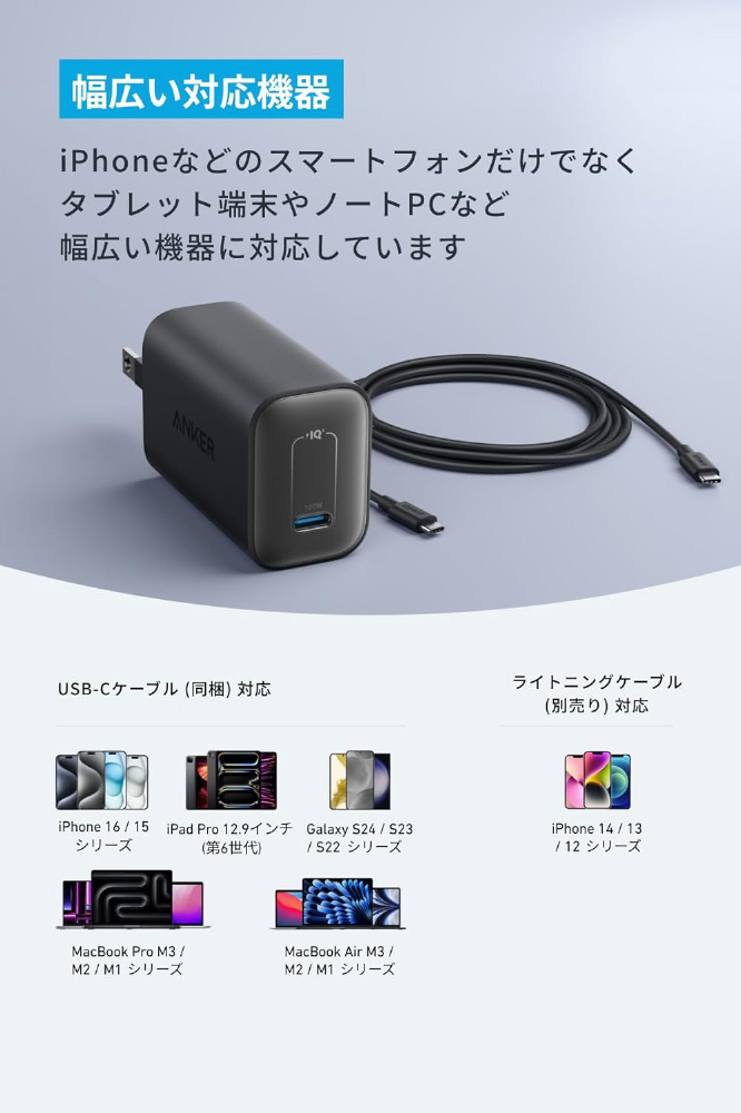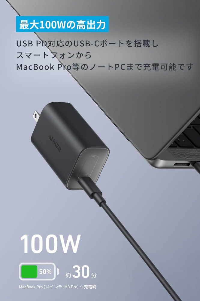 Anker Nano Charger (100W) with USB-C & USB-C ケーブル ホワイト B2679N21 [USB Power Delivery対応] 【sof001】