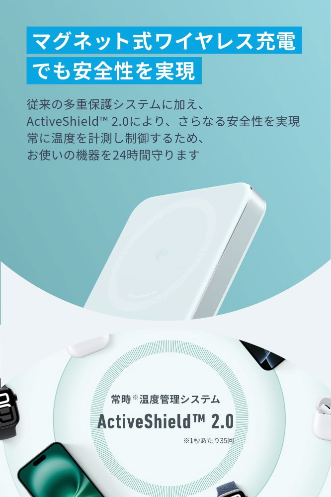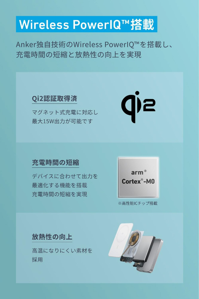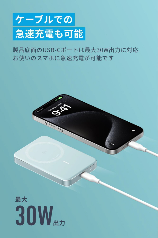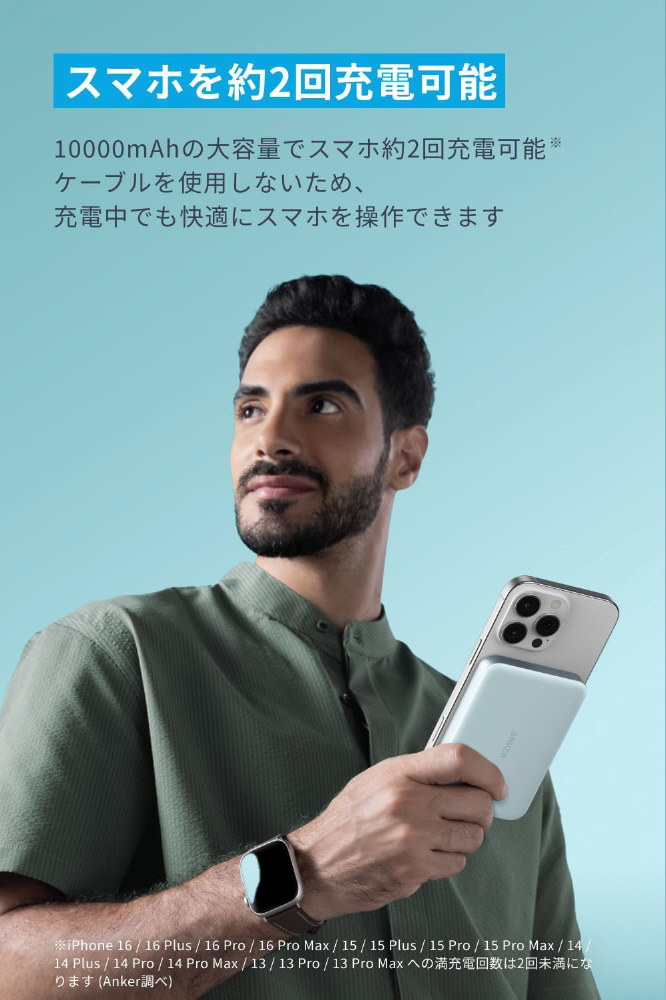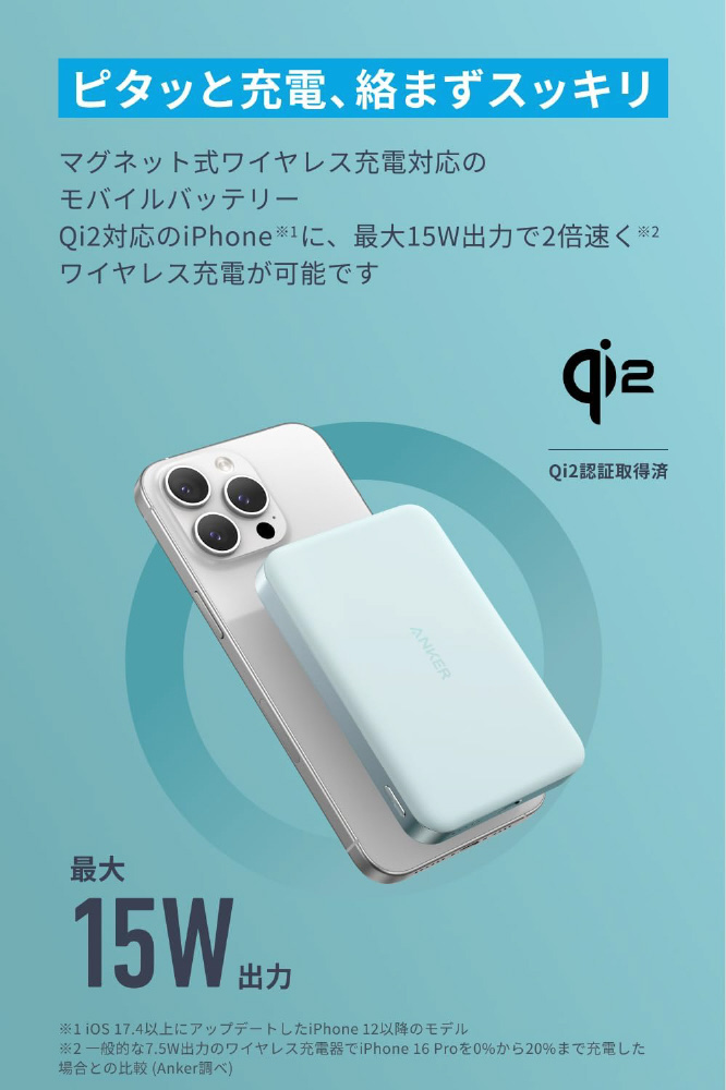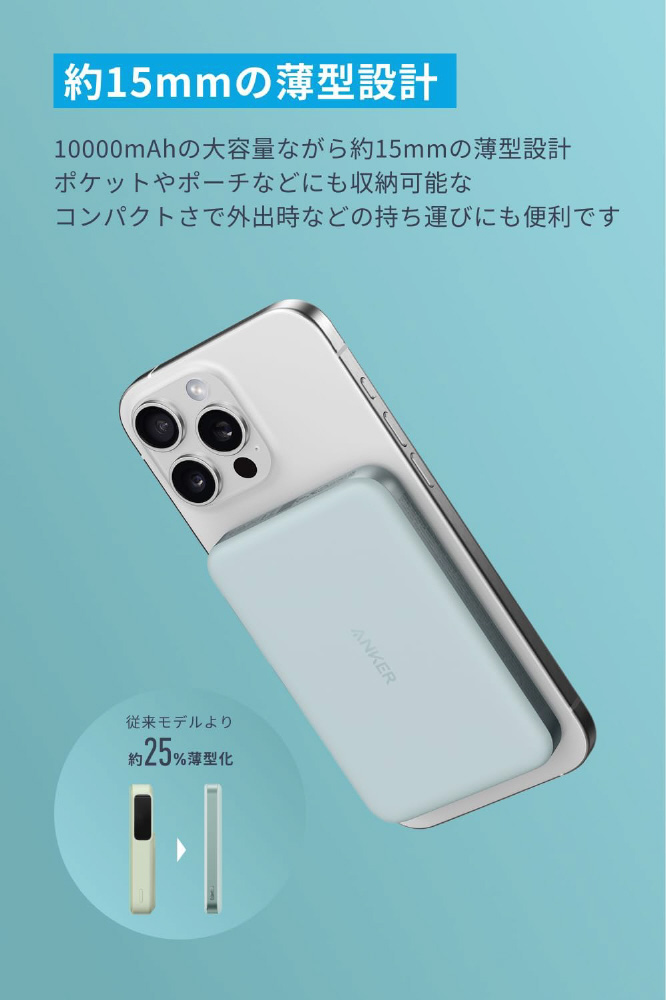 ワイヤレス充電対応モバイルバッテリー Anker MagGo Power Bank(10000mAh、Slim) ミントブルー A1664N61 [USB Power Delivery対応 /2ポート]