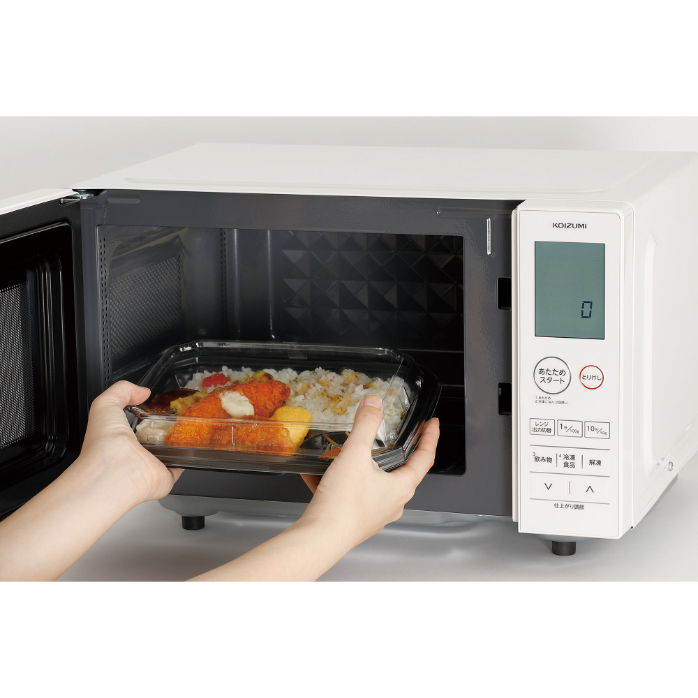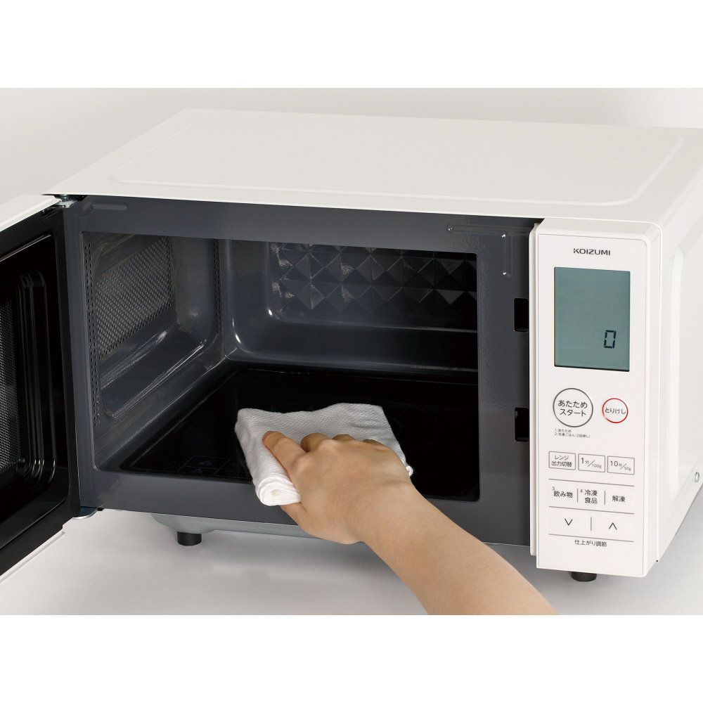 お手入れ簡単フラット庫内、見やすい大型液晶表示のデカ文字、自動あたため機能搭載(湿度センサー)