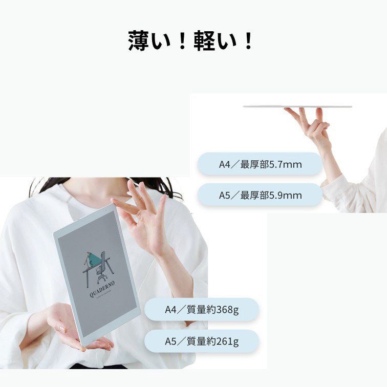 驚きの薄さと軽さが「クアデルノ」の魅力です。このコンパクトボディに、約22GBもの使用可能領域を持つメモリーを搭載。一般的な大学ノート約20万冊分を保存できます。