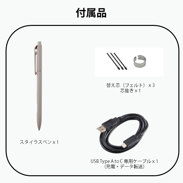 | 仕様3 | 充電時間:約2.5時間(USB PD充電器接続時)/約7時間(USB充電)、持続時間:最長2週間(WiFiオフ時)/最長5日間(WiFiオン時) |