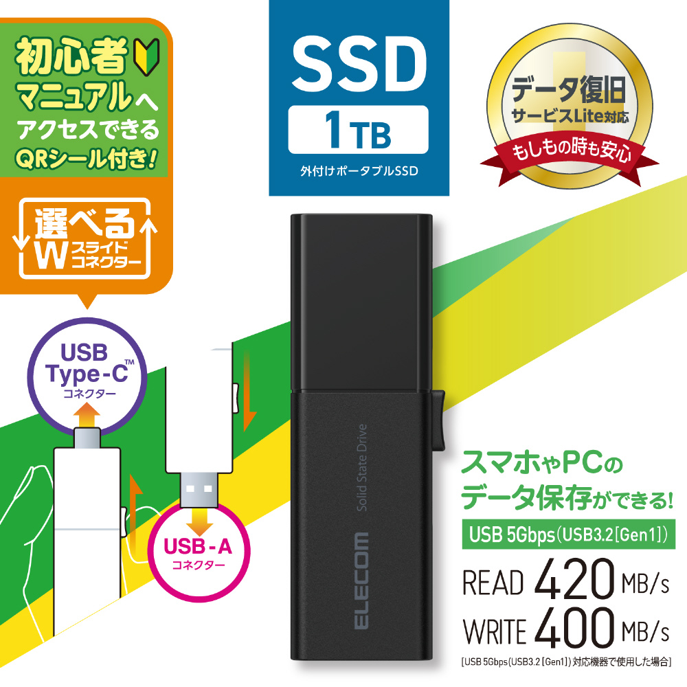 スマホの中の写真や動画も、挿すだけでかんたん保存!大量の写真や動画、ゲームソフトを保存できる外付けポータブルSSDです。開封後ほとんどのスマートフォンやパソコンでそのまま挿して使用可能。「初心者向けマニュアル」にすぐにアクセスできるQRシール付きで、初めてSSDを手に取る方にも安心してお使いいただけます。