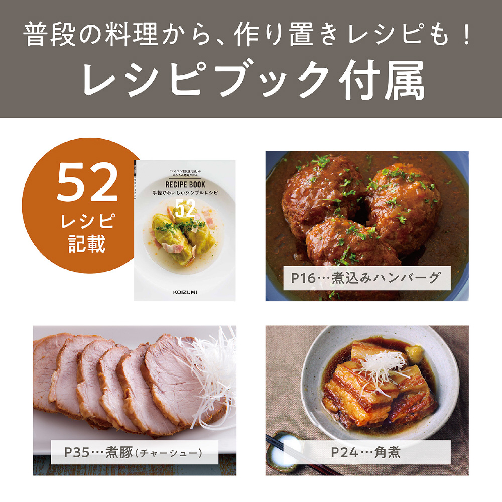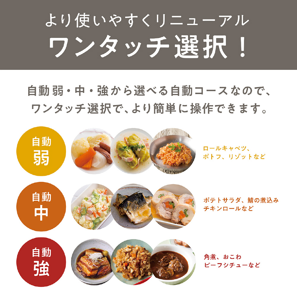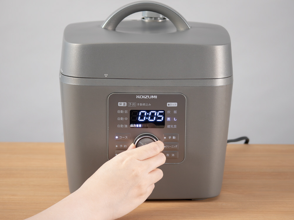 圧力の強さを選ぶだけの簡単操作の自動コース、予約時間設定(最大19.5時間)保温(12時間タイマー)付き