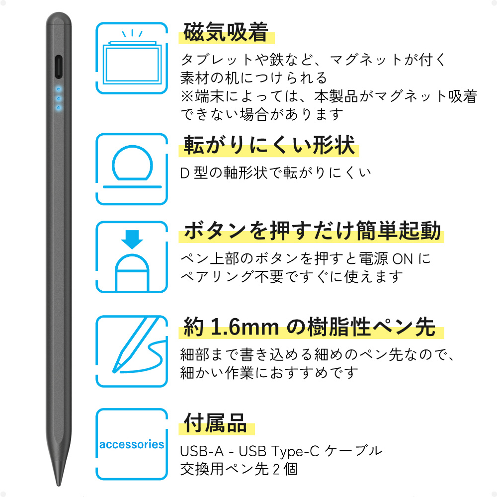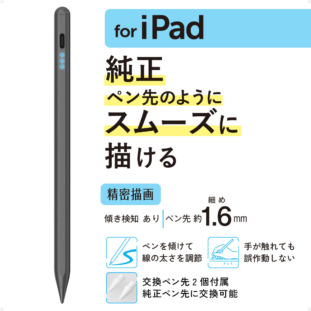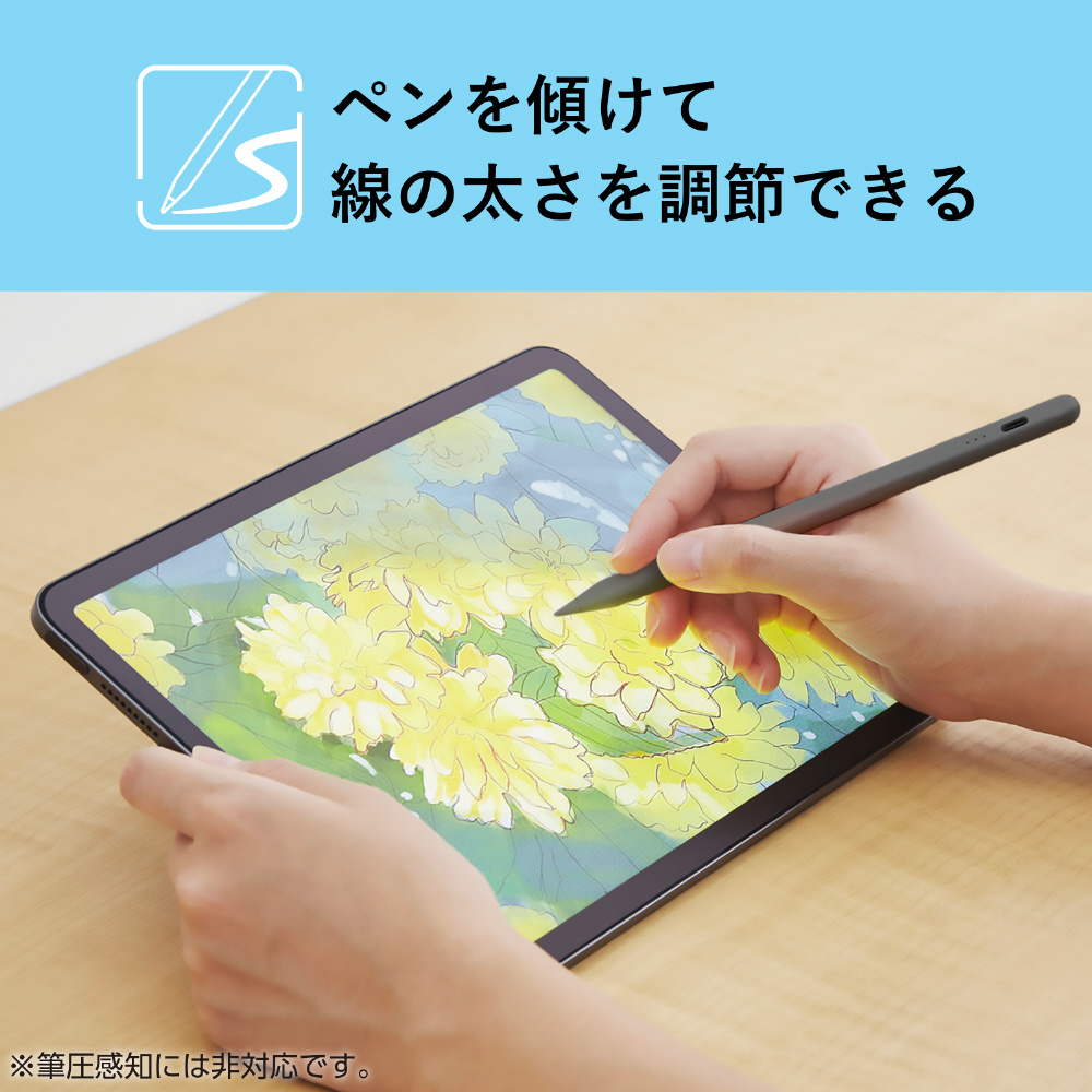 隙間時間の充電ですぐに使える!約20分でフル充電可能な急速充電機能を搭載した、iPad用アクティブタッチペンです。約1.6mmのペン先で細かい作業、メモや絵を描くのにおすすめ。ペンの傾き具合で線の太さを変えられる機能や、誤動作を防止するパームリジェクションにも対応しています。