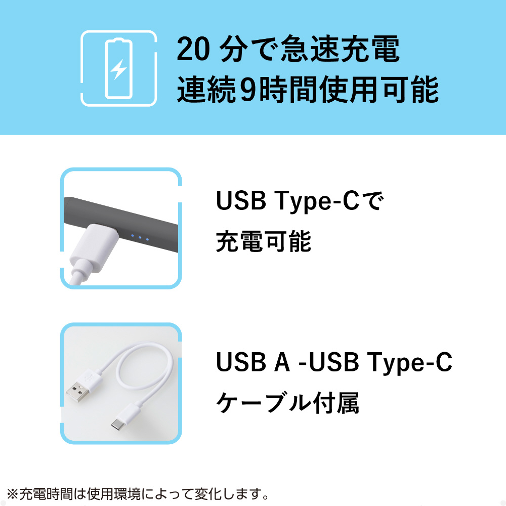 USB Type-Cケーブルで充電が可能で、約9時間の連続使用が可能です。