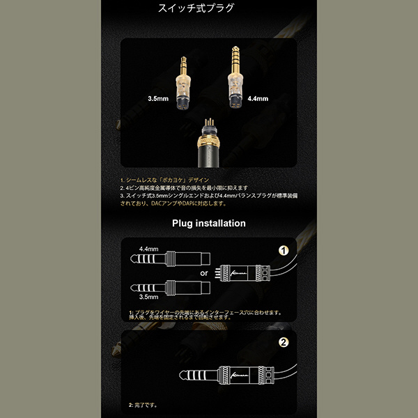 MIAは0.78 2Pin及びMMCXインターフェイスを脱着式とし交換可能なスイッチング方式を採用しています。同時にプラグに関しても3.5mm/4.4mmのスイッチング式としており、幅広いシーンでご利用いただけるリケーブルモデルとなります。