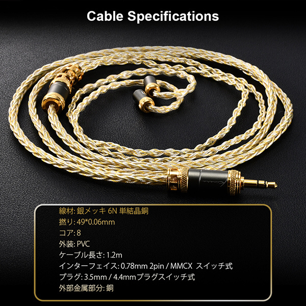 | 仕様3 | インターフェイス:MMCX or 0.78 2Pin スイッチ式 プラグ:4.4mmバランス/3.5mmアンバランス付属 プラグ脱着式(4PIN) |