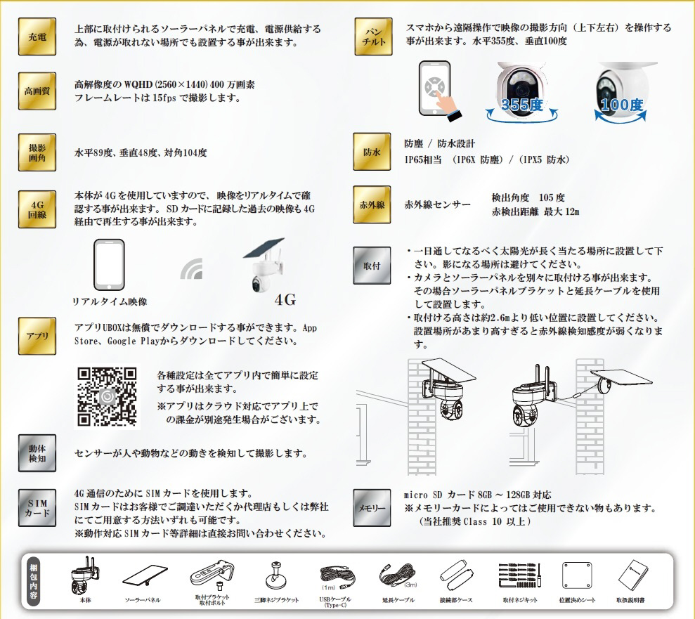 高解像度のWQHD撮影400万画素、ソーラーパネルで充電、電源が取れない場所でも設置可能、本体4G対応、双方向音声通信に対応、防塵/防水設計、動体検知センサー内蔵、家庭用AC電源使用可能、パンチルト対応カメラ