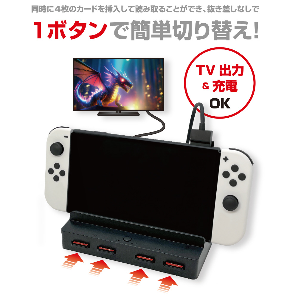 同時に4枚のカードを挿入して読み取ることができ、抜き差しなしで1ボタンで簡単切り替え!TV出力&充電OK!