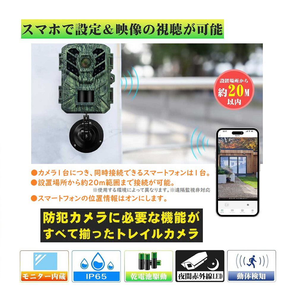 この防犯・トレイルカメラは、Wi-Fi接続が可能で、専用のスマホアプリを通じて
