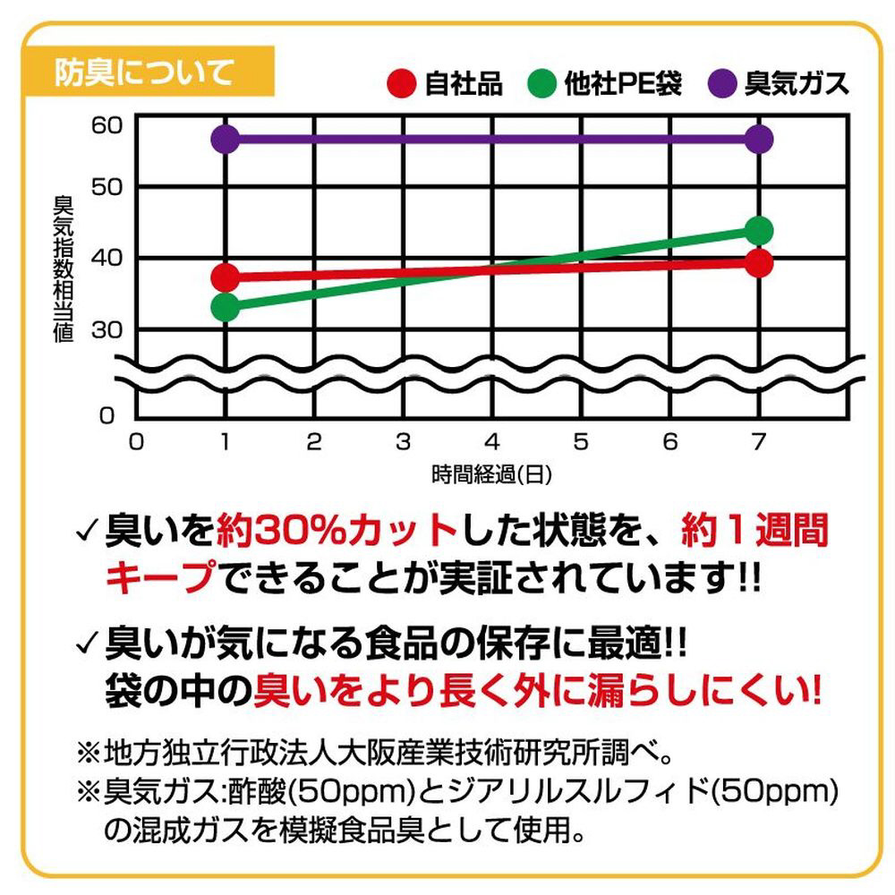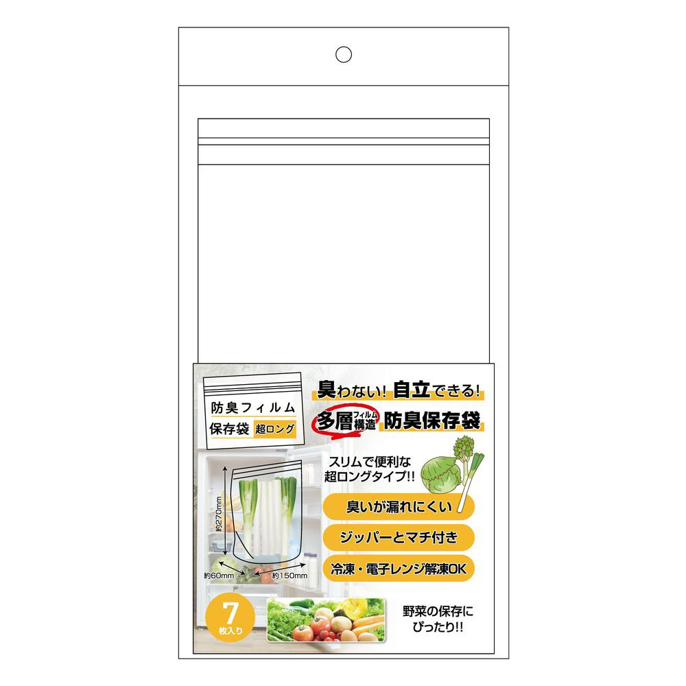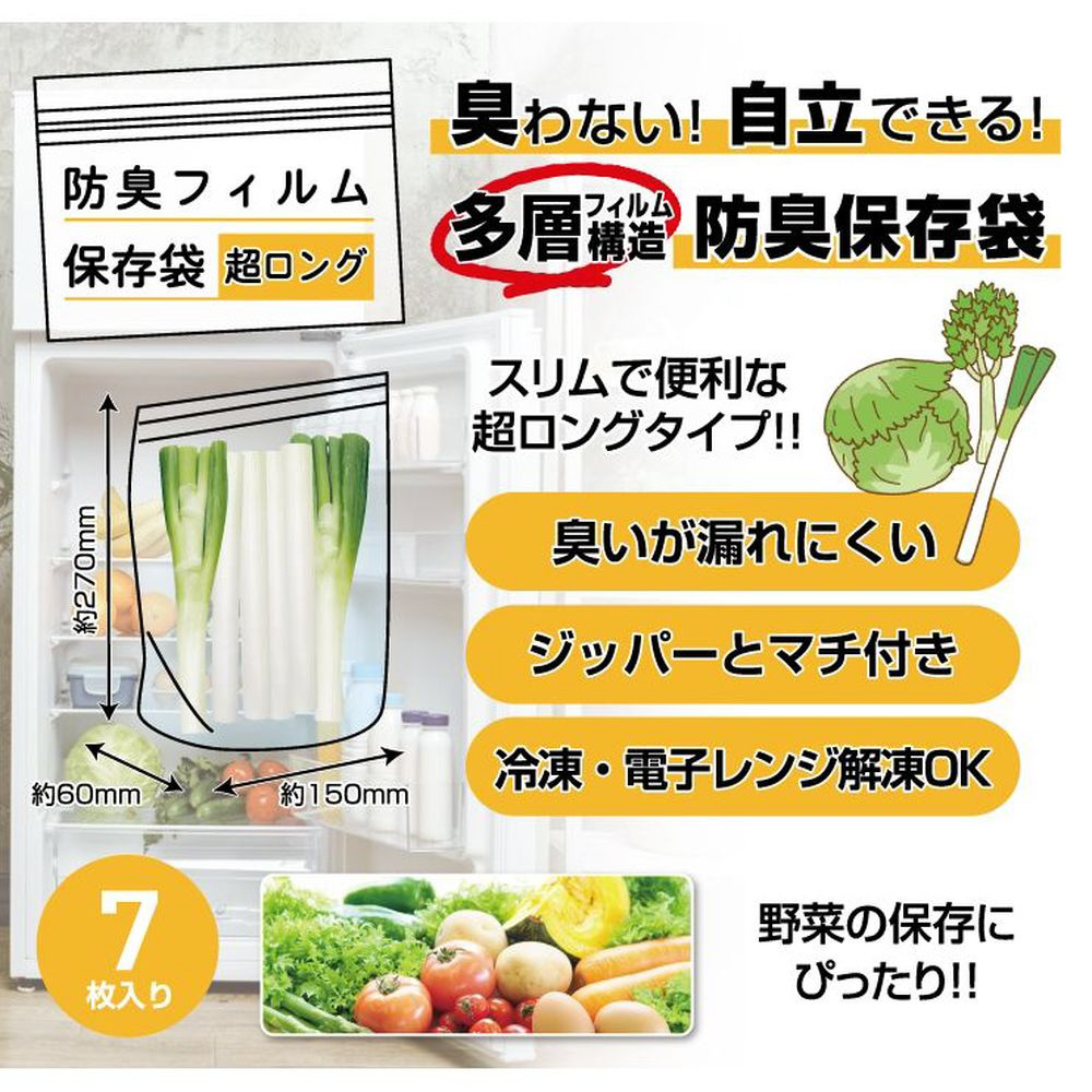 特殊多層フィルム構造でにおわない防臭保存袋です。多層フィルム構造で臭いが漏れにくいので、野菜の保存にぴったりです。ジッパー付きなので野菜やお肉を密封保存できます。マチ付きで自立することができ、冷蔵庫での保存などに便利です。冷凍・電子レンジ解凍に対応しています。(通常加熱モードには対応していません。)臭いを約30%カットした状態を、約1週間キープできます。スリムで便利な超ロングタイプです。【仕様】耐熱温度:100度 耐冷温度:−30度