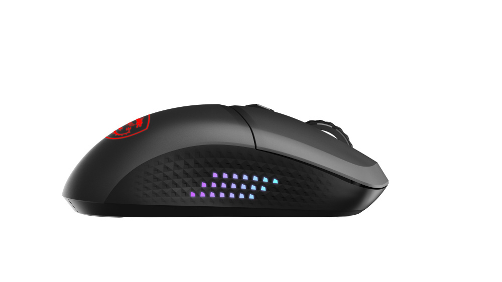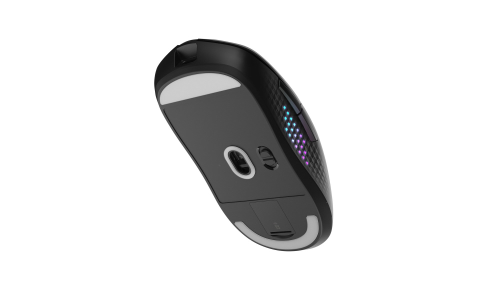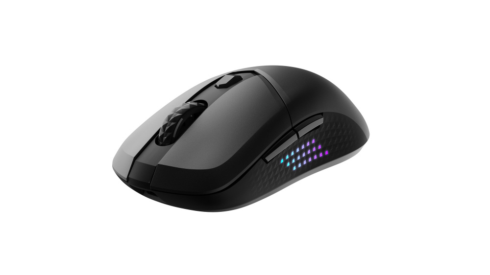 無線・Bluetooth・有線接続に対応。65gの軽量設計と左右対称デザインを採用し、サイドグリップにRGB LEDを装備したゲーミングマウス