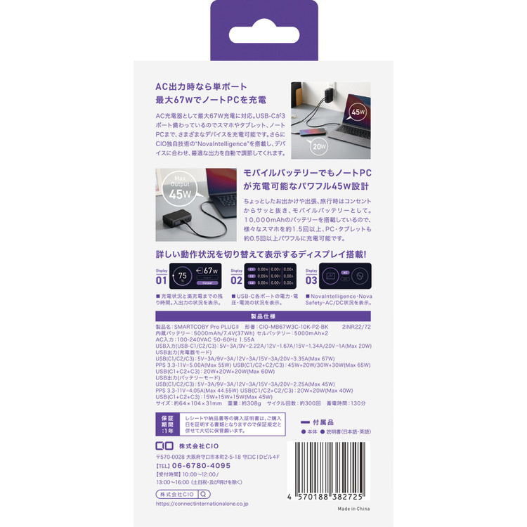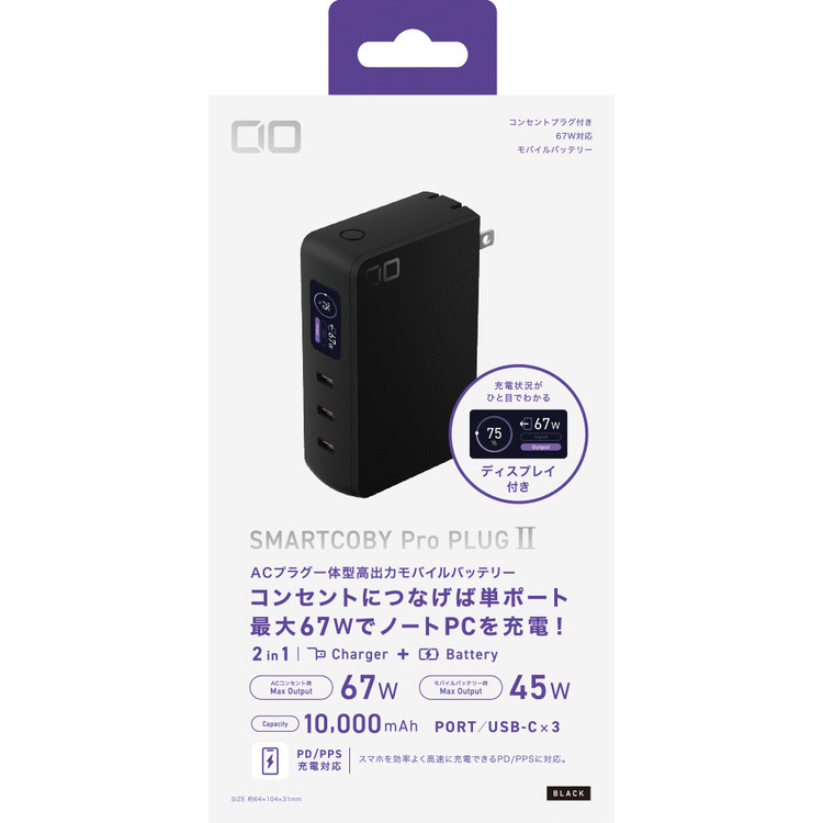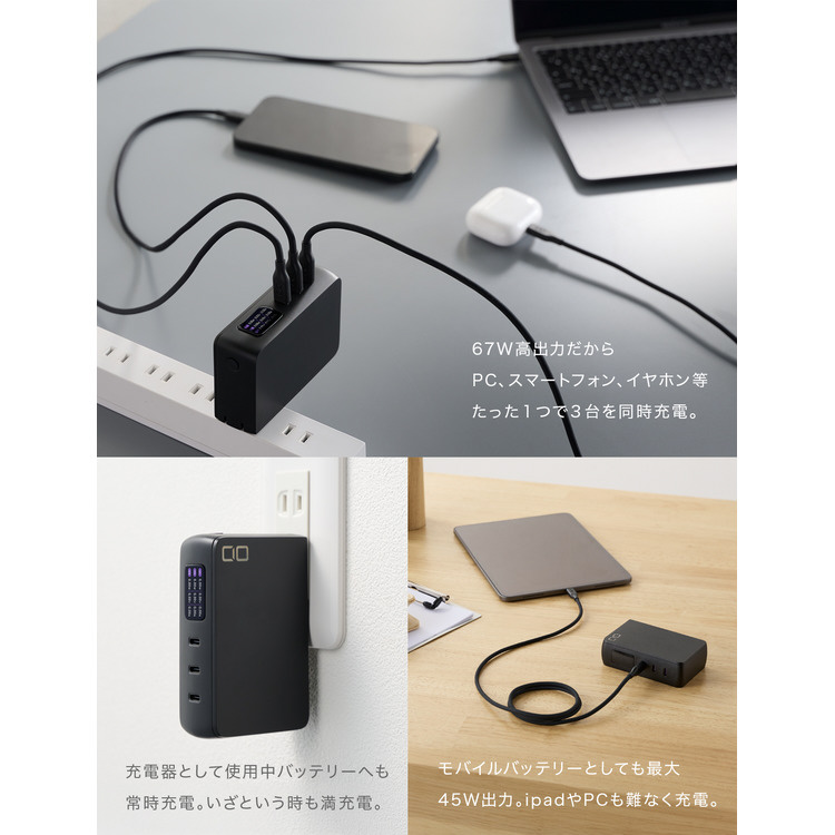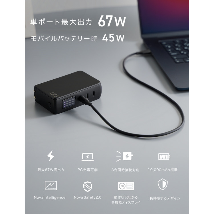 最大67W出力、タイプCポートを3ポート搭載の急速充電器と、高出力モバイルバッテリーが一体化。コンセントから抜いての使用時も、10000mAhで最大45Wの高出力を実現。外出先でノートパソコンも充電できるモバイルバッテリーです。