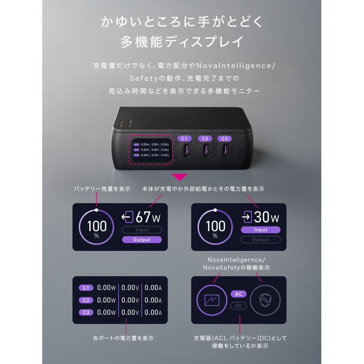 各USBポートの充電速度をリアルタイムで確認できるスクリーンを搭載。バッテリー残量のみならず、「45W」「65W」といった充電出力を見える化し、スマホやPCを立ち上げなくても確認できます。さらにCIO独自技術NovaIntelligence(自動振り分け機能)やNovaSafety(安全機能)の動作状況も表示されます。