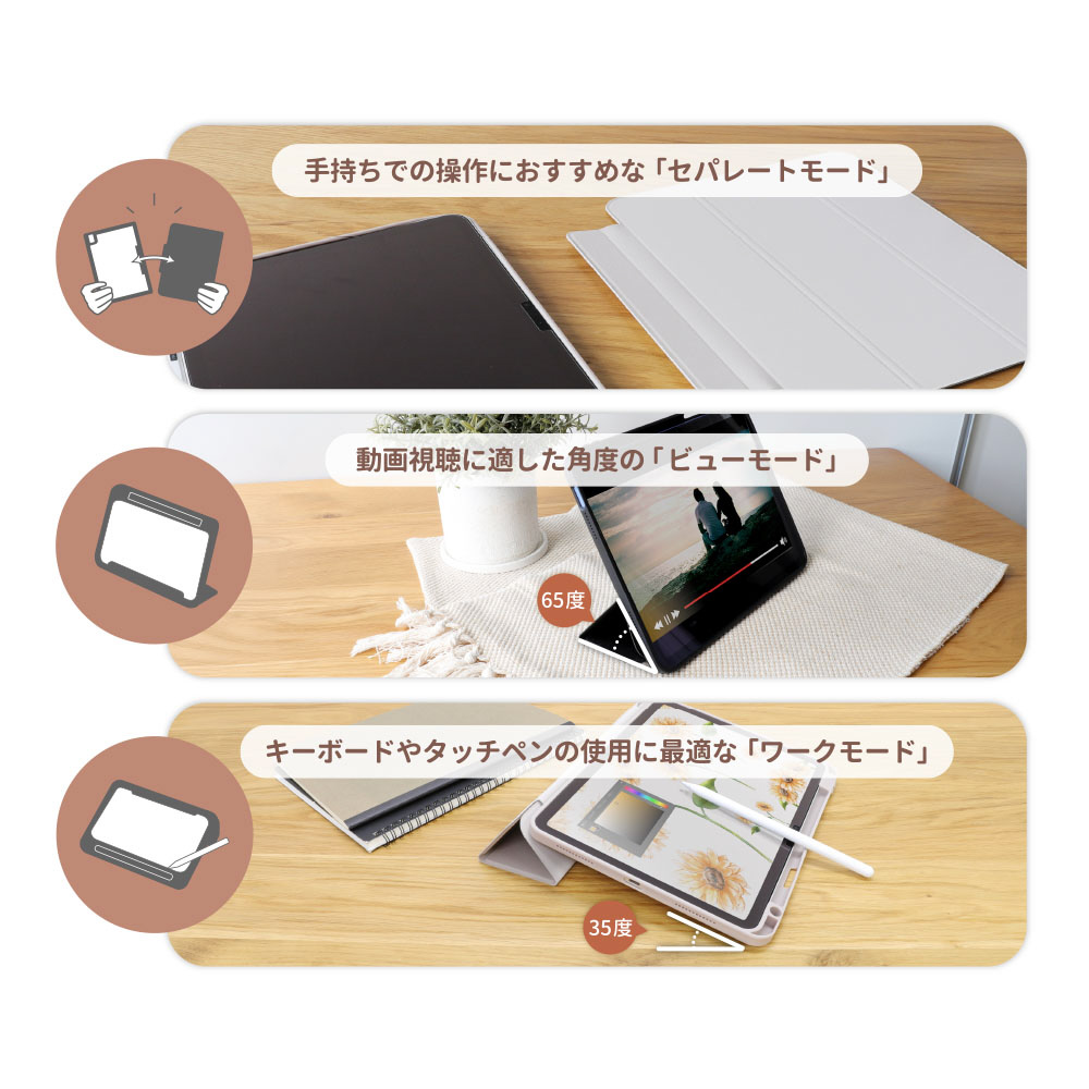 手持ちでの操作におすすめな『セパレートモード』、動画視聴に適した角度(65度)の『ビューモード』、タッチペンやキーボードの使用に最適な角度(35度)の『ワークモード』の3Wayでお使いいただけます。