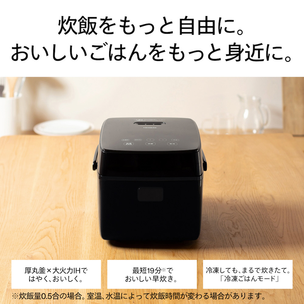 ごはんがおいしいと、食事はもっと楽しくなる。炊きたてのおいしいごはんにもっと気軽に手が届くように、米どころ新潟・燕三条のメーカー、ツインバードが、少ない量でも、おいしくはやく炊ける炊飯器をつくりました。生活リズムを炊飯時間に合わせなくても、ちょっとの時間で炊き上がったり、また炊き上がり時間を少し遅らせたりするだけで、時間をもっと有効活用できます。冷凍ごはんモードなら、一気に炊いてもずっとおいしく。自由な生活スタイルはそのままで。おいしいごはんのためになにかを変えなくても、この炊飯器で、“炊飯”が変わります。