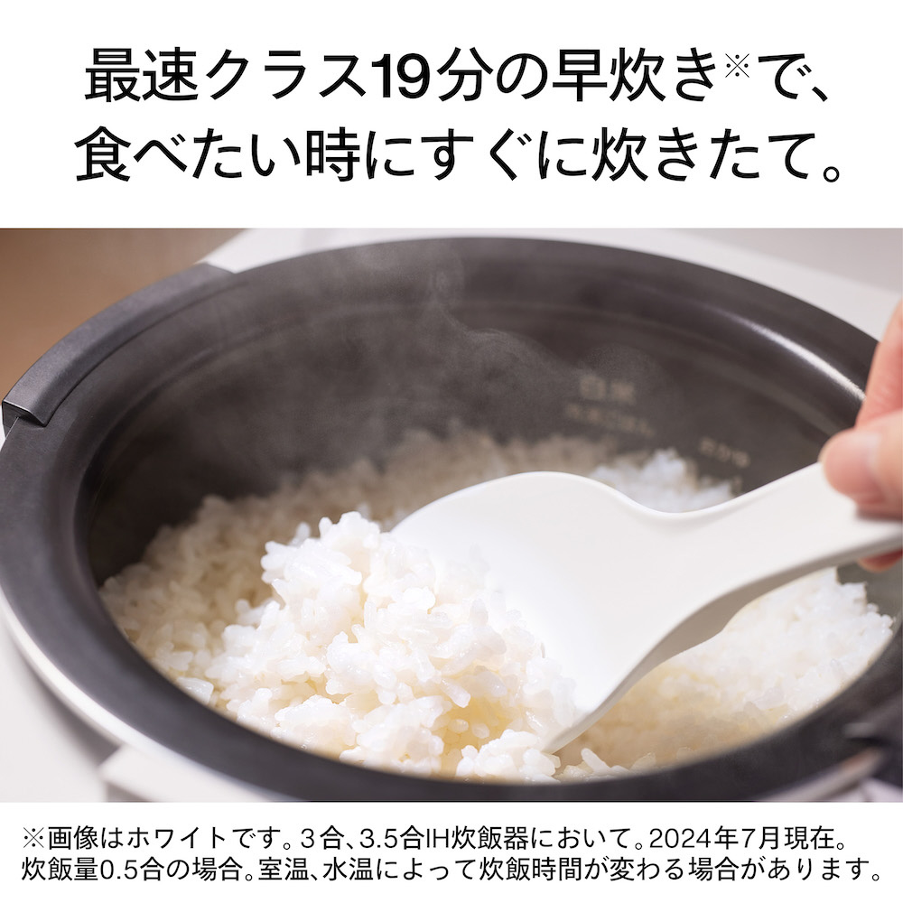 ※3合、3.5合IH炊飯器において。2024年7月現在。メーカー調べ。 室温26℃、水温26℃、白米、炊飯量0.5合、早炊きモードの場合。炊き上がり時間は周囲の気温や水温によって変動する場合があります。