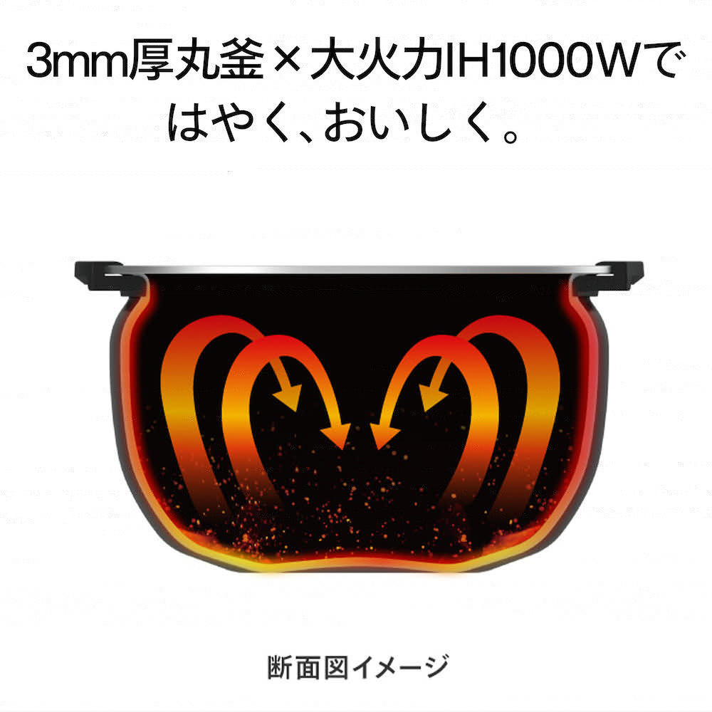 大火力1000Wと厚さ3mmの厚丸釜で、早い炊き上がりとおいしさにこだわったコンパクトな炊飯器。