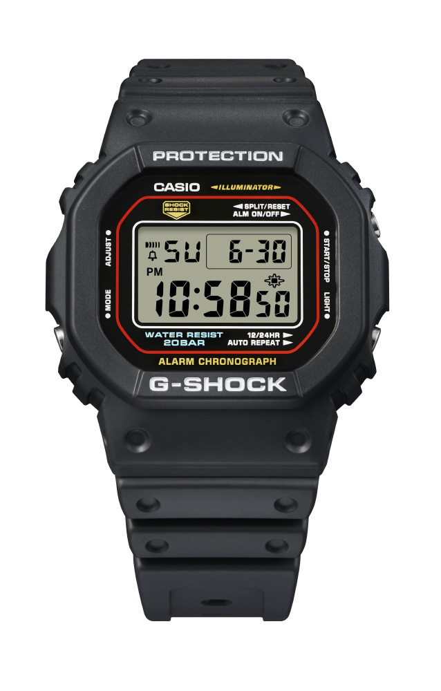 オリジナルモデルで採用されていた、G-SHOCKのブランドカラーでもあり挑戦し続ける情熱を意味する赤色、高い防水性を表す青色、ショックレジスタントを意味する黄色を忠実に再現しています。