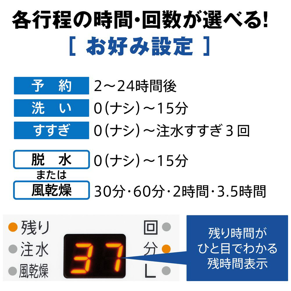 予約運転は2〜24時間後まで設定可能。洗い時間・すすぎ回数・脱水時間もお好みで選べるので、汚れ具合や洗濯物に合わせた「お好み」の洗い方が設定できます。