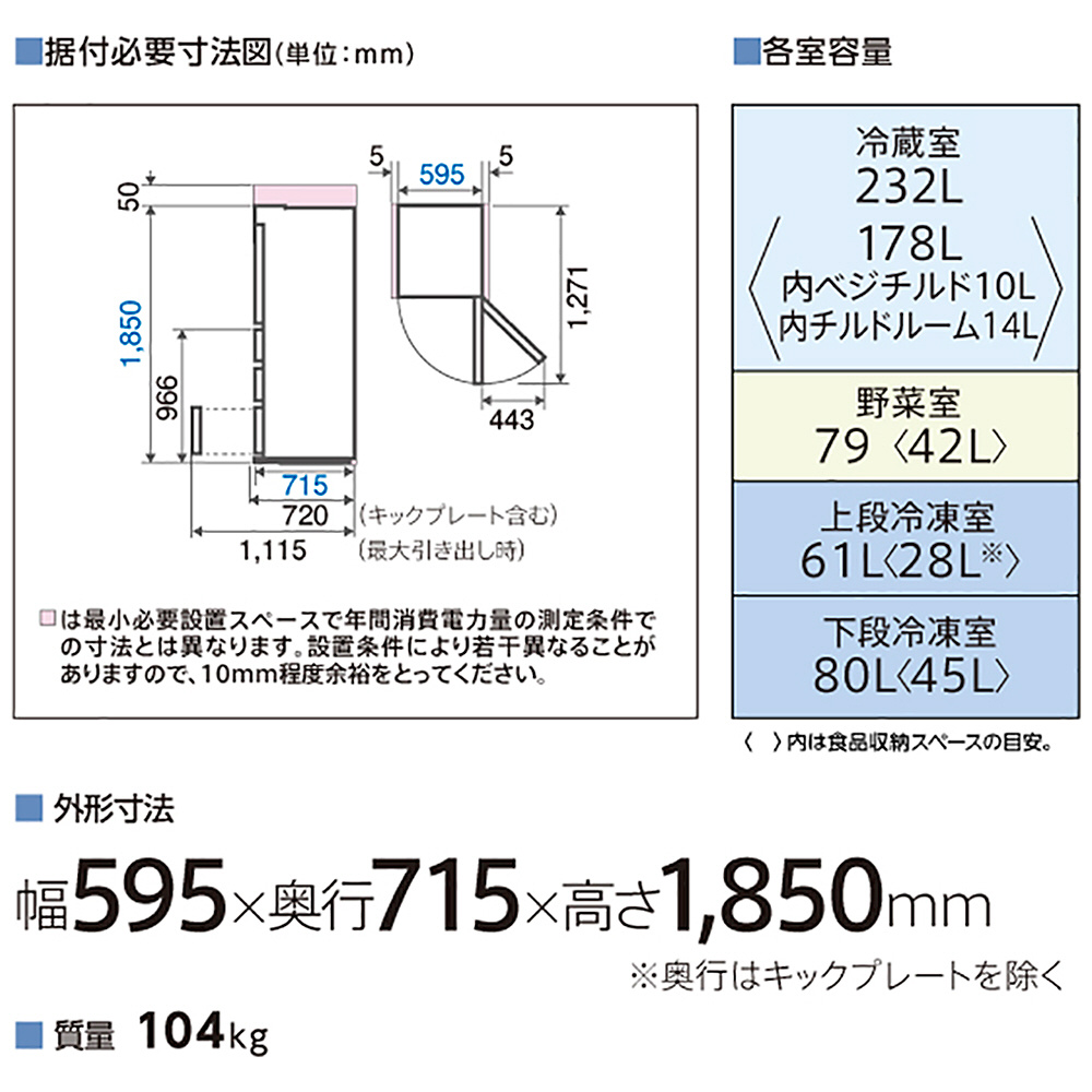 | 仕様1 | 食品収納スペースの目安 ・冷蔵室: <178L> ・内ベジチルド: <10L> ・内チルドルーム: <14L> ・野菜室: <42L> ・上段冷凍室: <28L> ・下段冷凍室: <45L> |