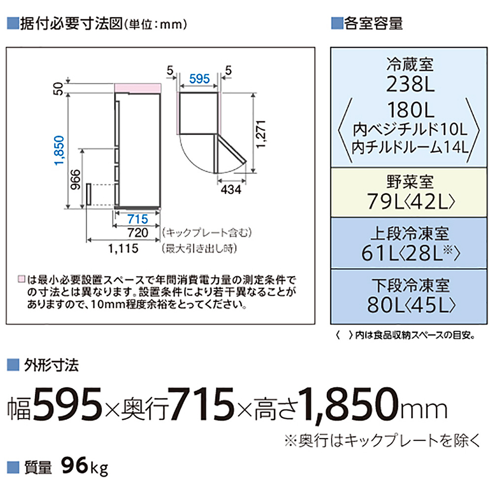 | 仕様1 | 食品収納スペースの目安 ・冷蔵室: <180L> ・内ベジチルド: <10L> ・内チルドルーム: <14L> ・野菜室: <42L> ・上段冷凍室: <28L> ・下段冷凍室: <45L> |