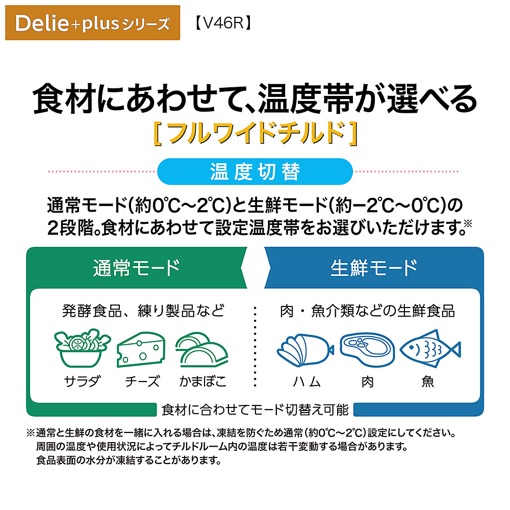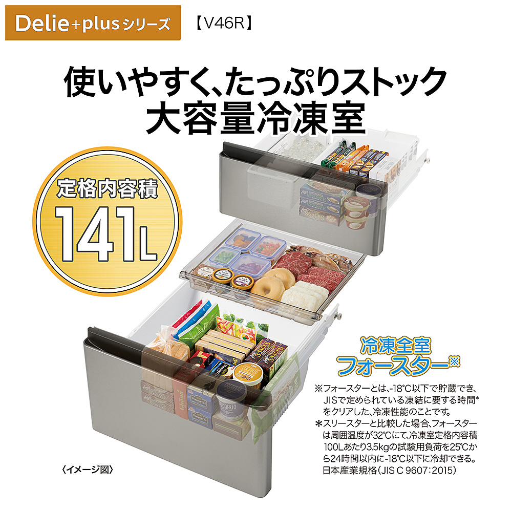 ※フォースターとは、-18℃以下で貯蔵でき、JISで定められている凍結に要する時間*をクリアした、冷凍性能のことです。*スリースターと比較した場合、フォースターは周囲温度が32℃にて、冷凍室定格内容積100Lあたり3.5kgの試験用負荷を25℃から24時間以内に-18℃以下に冷却できる。日本産業規格(JIS C 9607:2015)