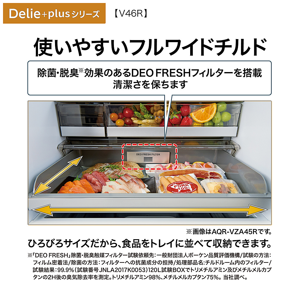 ※「DEO FRESH」除菌・脱臭触媒フィルター試験依頼先:一般財団法人ボーケン品質評価機構/試験の方法:フィルム密着法/除菌の方法:フィルターへの抗菌成分の担持/処理部品名:チルドルーム内のフィルター/試験結果:99.9%(試験番号JNLA2017K0053)120L試験BOXでトリメチルアミン及びメチルメルカプタンの2H後の臭気除去率を測定。トリメチルアミン98%、メチルメルカプタン75%。当社調べ。