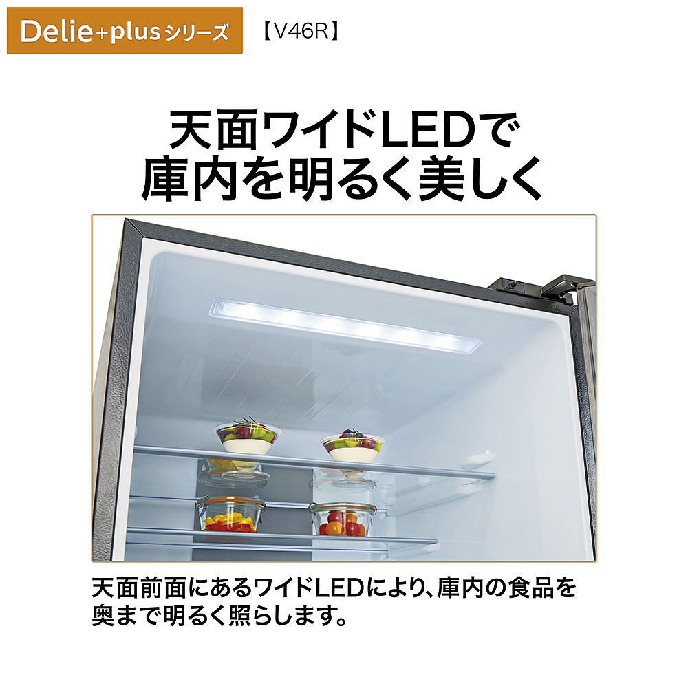 天面前面にあるワイドLEDにより、庫内の食品を奥まで明るく照らします。