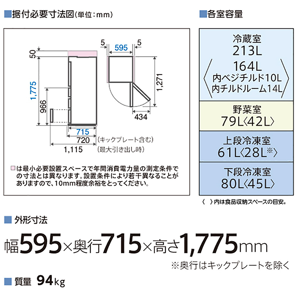 | 仕様1 | 食品収納スペースの目安 ・冷蔵室: <164L> ・内ベジチルド: <10L> ・内チルドルーム: <14L> ・野菜室: <42L> ・上段冷凍室: <28L> ・下段冷凍室: <45L> |