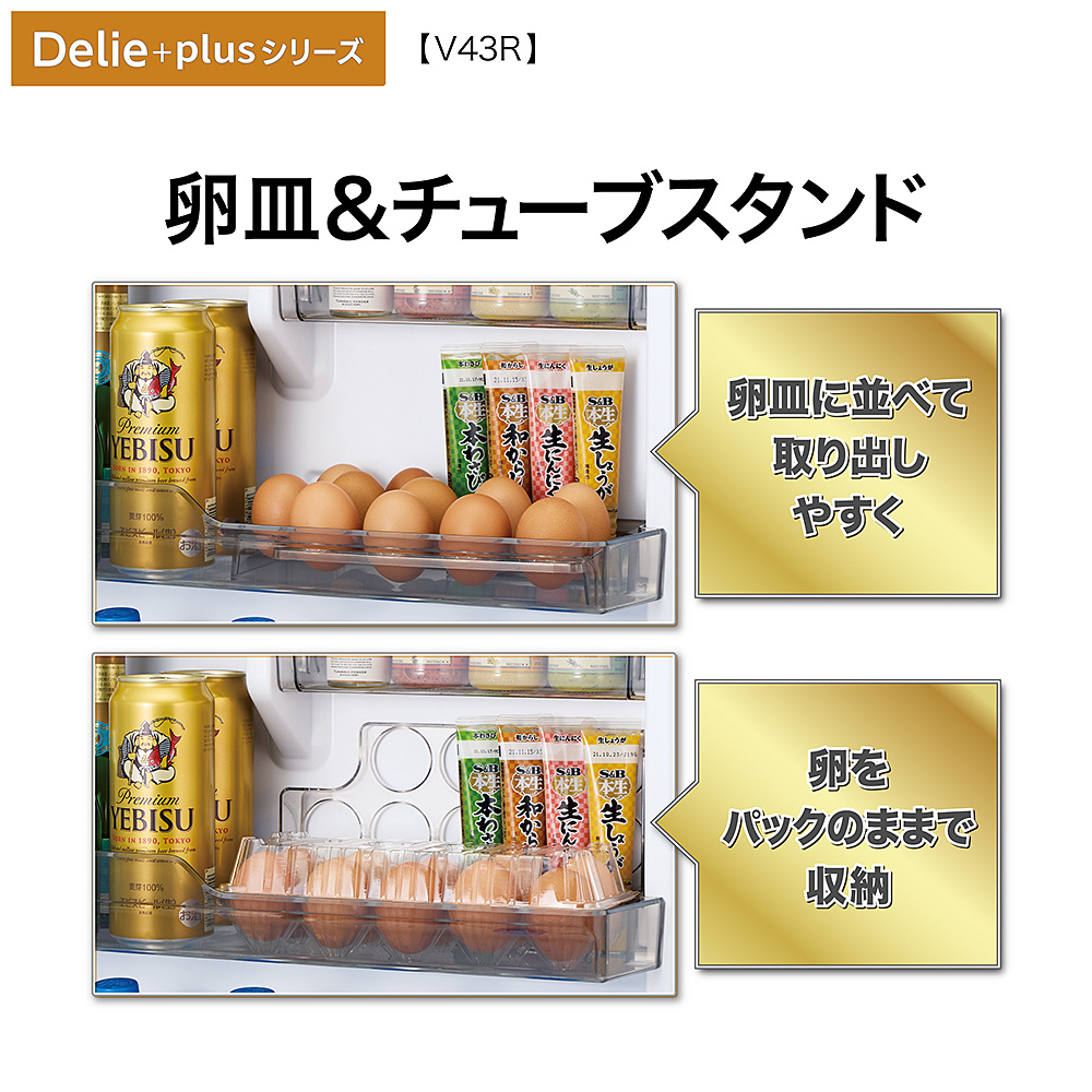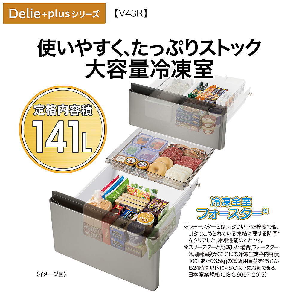 ※フォースターとは、-18℃以下で貯蔵でき、JISで定められている凍結に要する時間*をクリアした、冷凍性能のことです。*スリースターと比較した場合、フォースターは周囲温度が32℃にて、冷凍室定格内容積100Lあたり3.5kgの試験用負荷を25℃から24時間以内に-18℃以下に冷却できる。日本産業規格(JIS C 9607:2015)