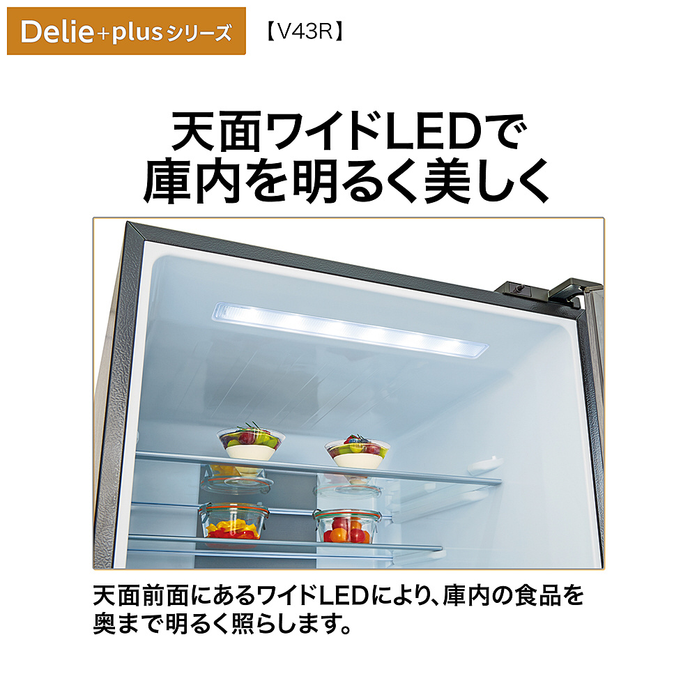 天面前面にあるワイドLEDにより、庫内の食品を奥まで明るく照らします。