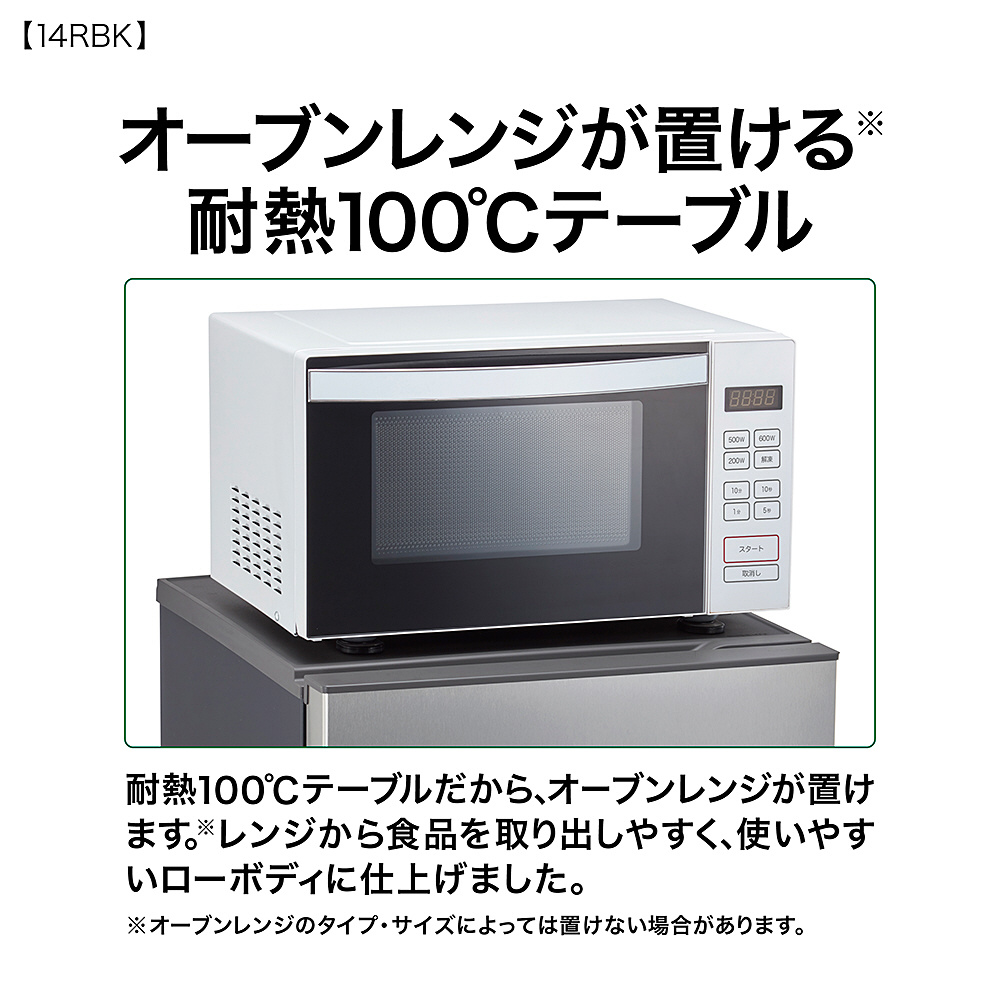 耐熱100℃テーブルだから、オーブンレンジが置けます※。レンジから食品を取り出しやすく、使いやすいローボディに仕上げました。