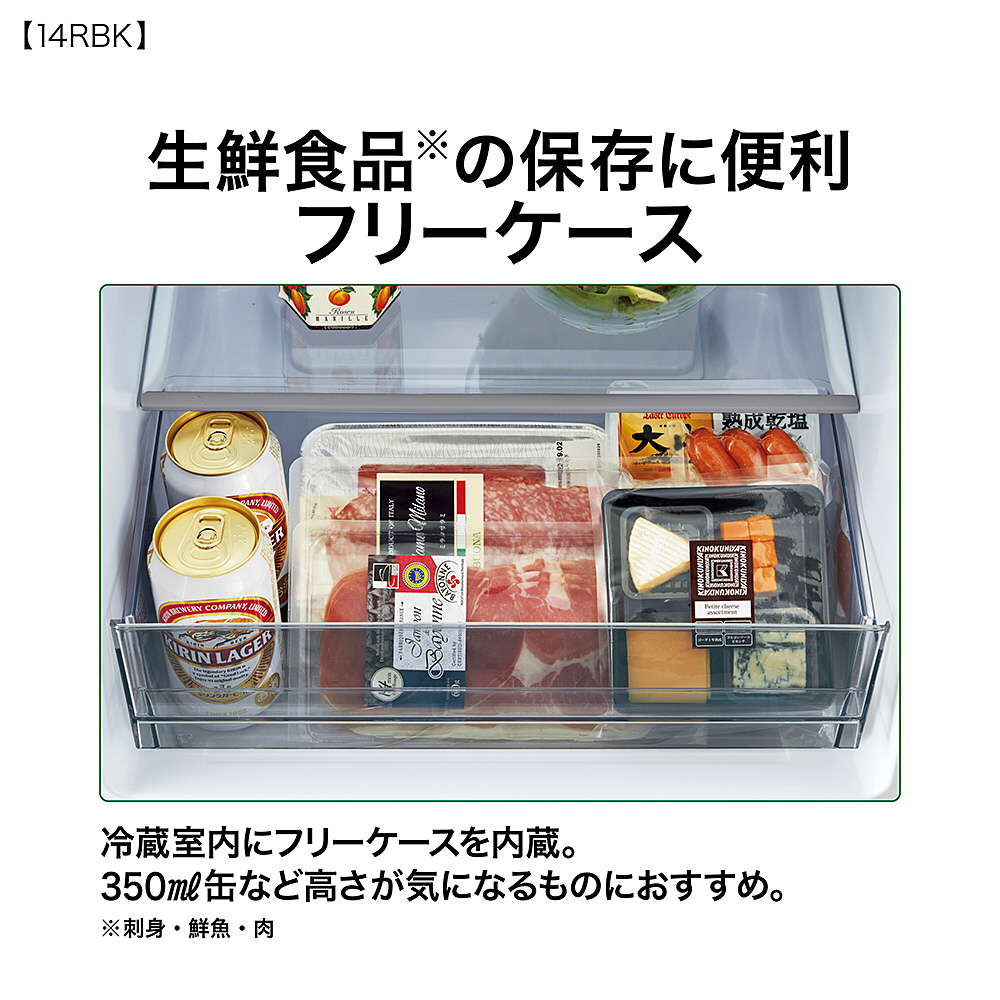 冷蔵室内に保存できるフリーケースを内蔵。350ml缶など高さが気になるものにもおすすめ。