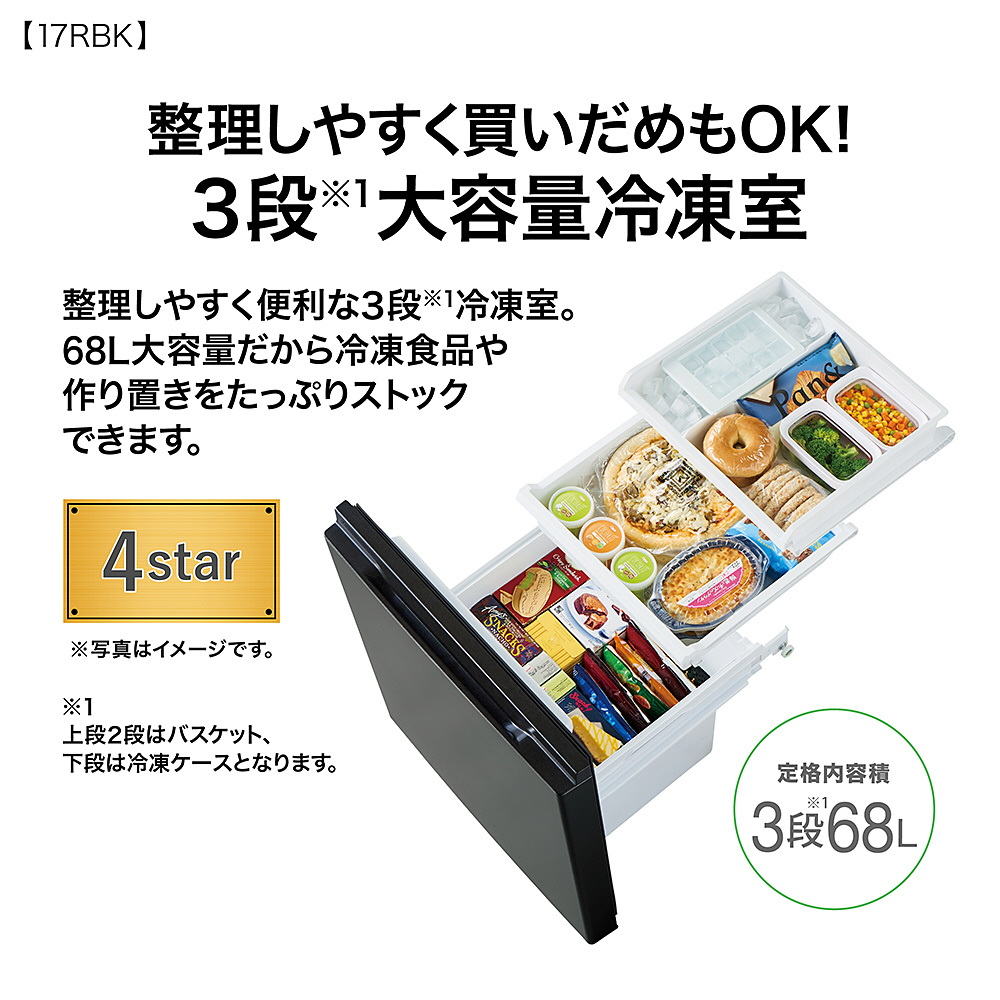整理しやすく便利な3段※冷凍室。68L大容量だから冷凍食品や作り置きをたっぷりストックできます。