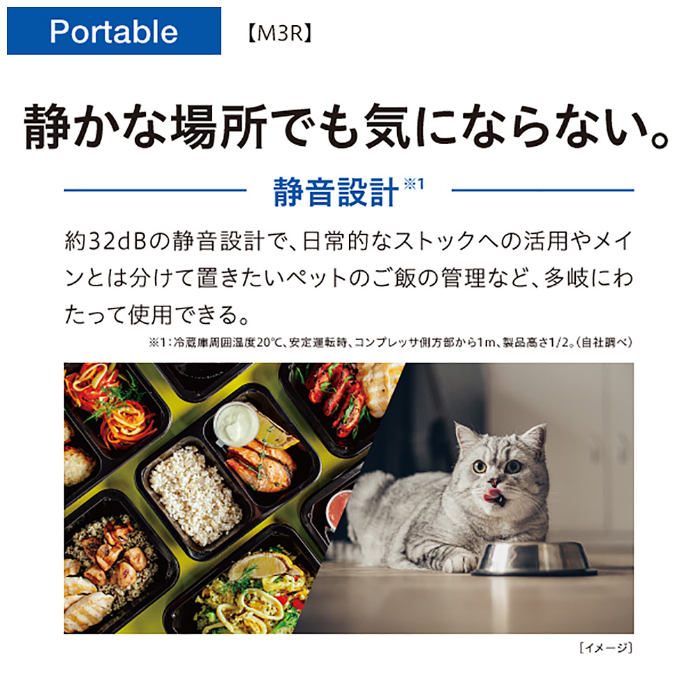 約32dBの静音設計で、日常的なストックへの活用やメインとは分けて置きたいペットのご飯の管理など、多岐にわたって使用できる。