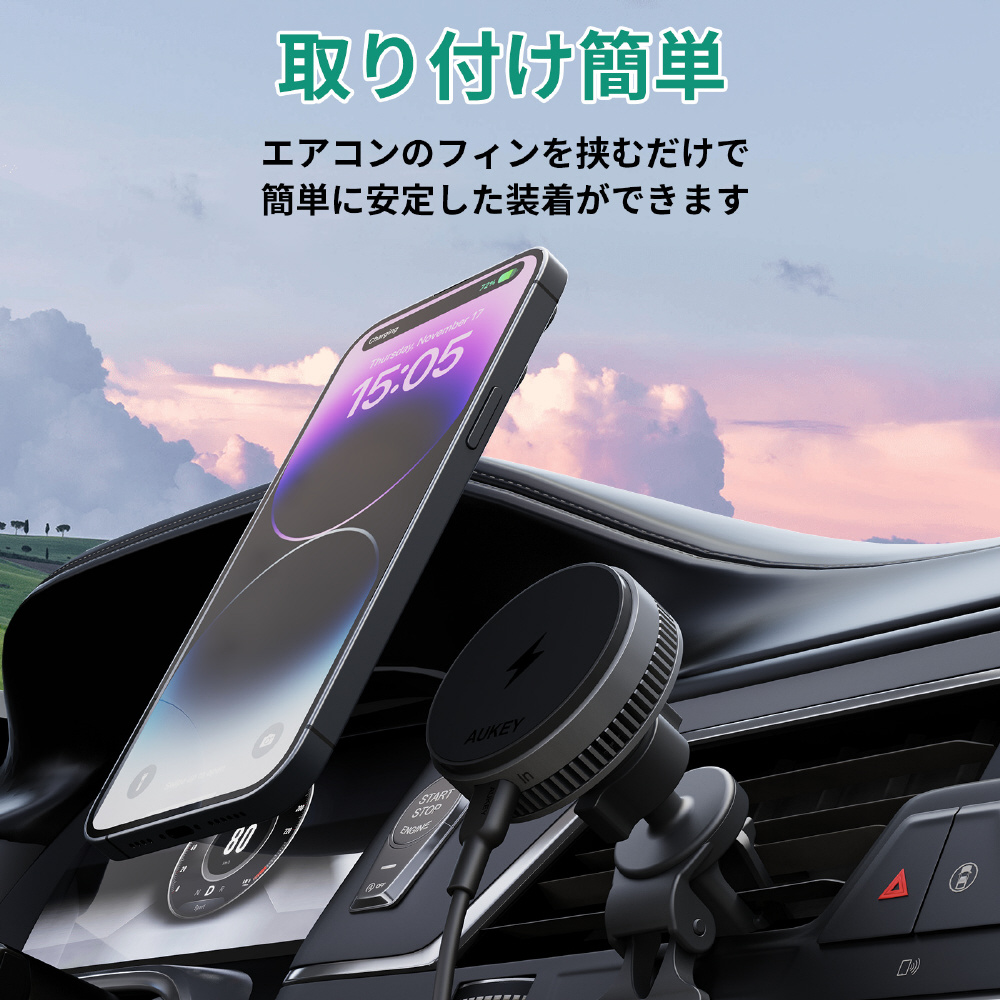 エアコンの吹き出し口に取り付けるだけで簡単に設置できます。MagSafe搭載iPhoneシリーズに強力な磁力でピタッと吸着し、安全でスムーズなワイヤレス充電が可能です。半導体冷却チップと冷却ファンを搭載し、ダブルの冷却機能がスマートフォンの温度上昇を抑制し、スムーズな充電をサポートします。ワイヤレス充電の最新規格Qi2の公式認証を取得。