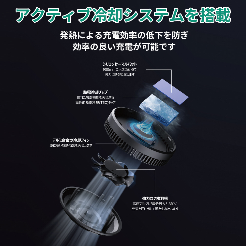 高性能な冷却ファンと熱電冷却チップを搭載しています。スマートフォンを効果的に冷却し、温度上昇を抑制し、発熱による充電効率の低下を防ぎます。