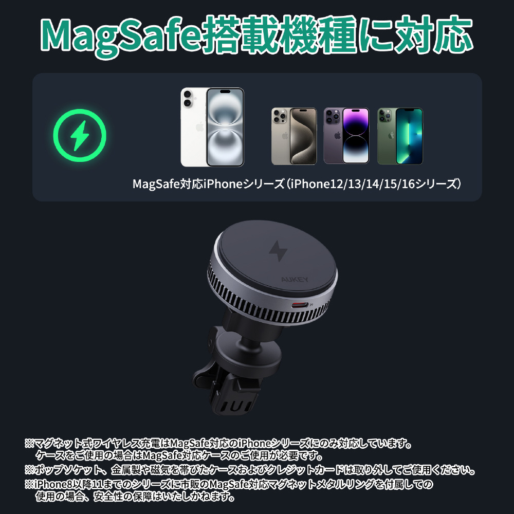 ※本製品はMagSafe対応のiPhoneシリーズでのご使用を推奨しております。MagSafe非対応の機種やケースに、MagSafe化をうたったマグネットステッカーなどを使用した場合の本製品の動作保証はいたしかねますので予めご了承ください。