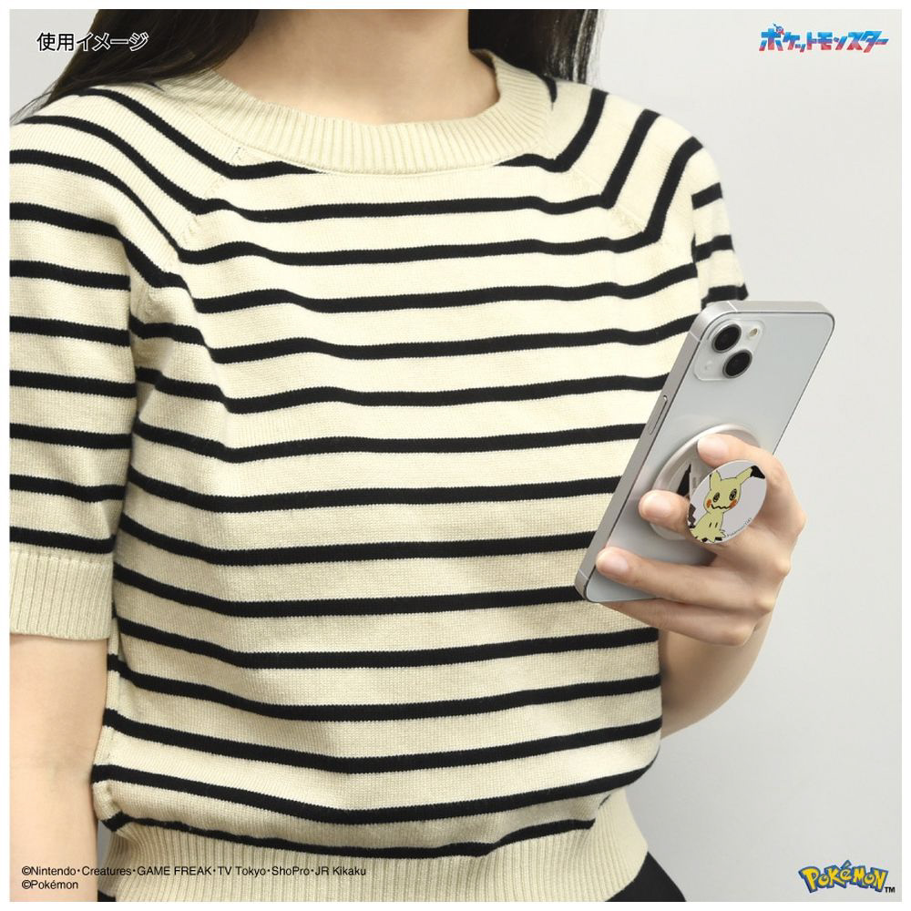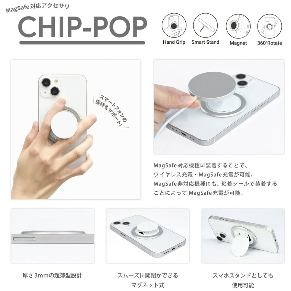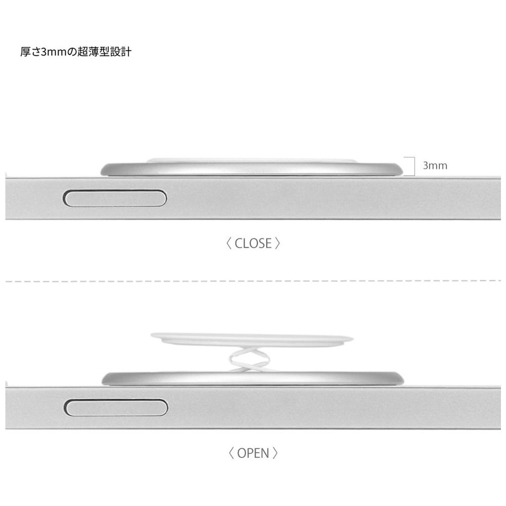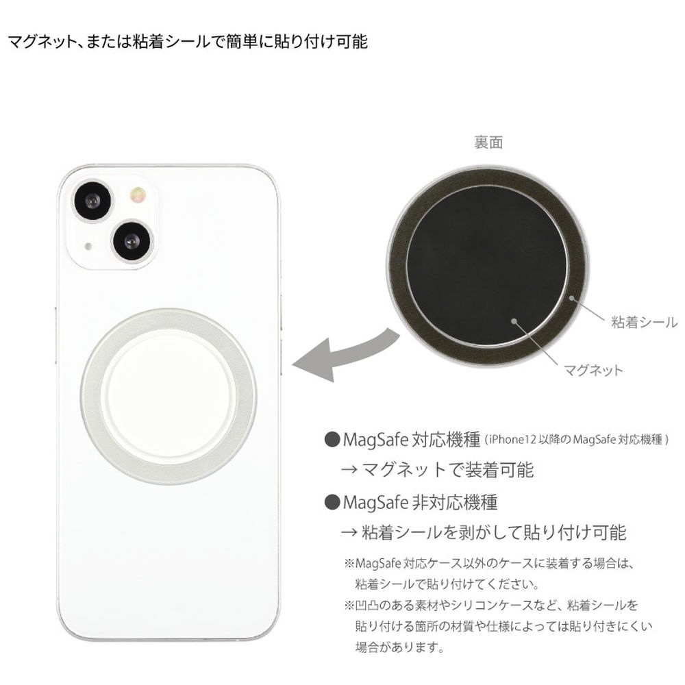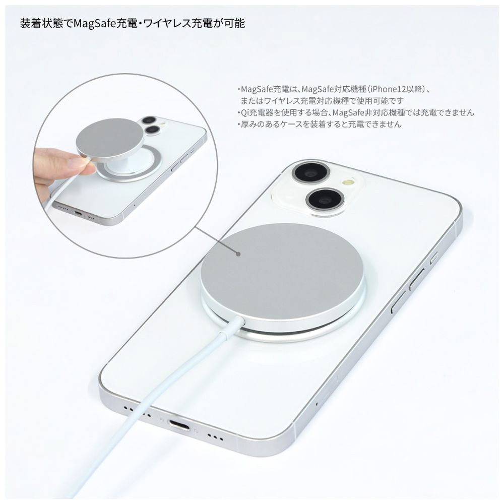 スマートフォンの保持をサポート。スマホスタンドにもなる!粘着シール付きなのでMagSafe非対応機種にも装着でき、装着することによってMagSafe充電が可能。