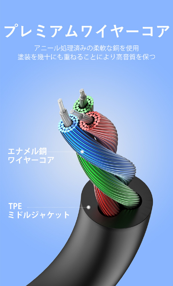 Hi-Fi オーディオでノイズ知らず。アニール処理済みの柔軟な銅を使用。塗装を幾十にも重ねることにより高音質を保ちます。しなやかなTPEジャケットを使用し、柔軟性と強度に優れたケーブル。