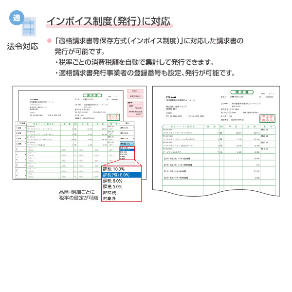 「適格請求書等保存方式(インボイス制度)」に対応した証憑の発行が可能です。