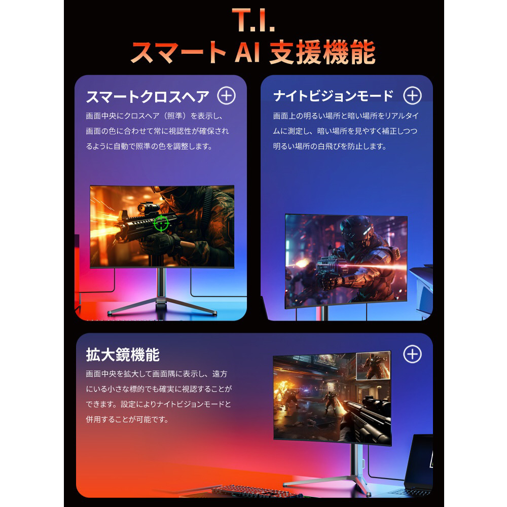 画面中央に照準を表示し、画面の表示色に応じて照準の色を調整するスマートクロスヘア機能や、暗い場所をリアルタイムで補正するナイトビジョンモード、画面中央の拡大映像を4隅に表示する拡大鏡機能などゲームプレイに役立つ機能を多数搭載しています。