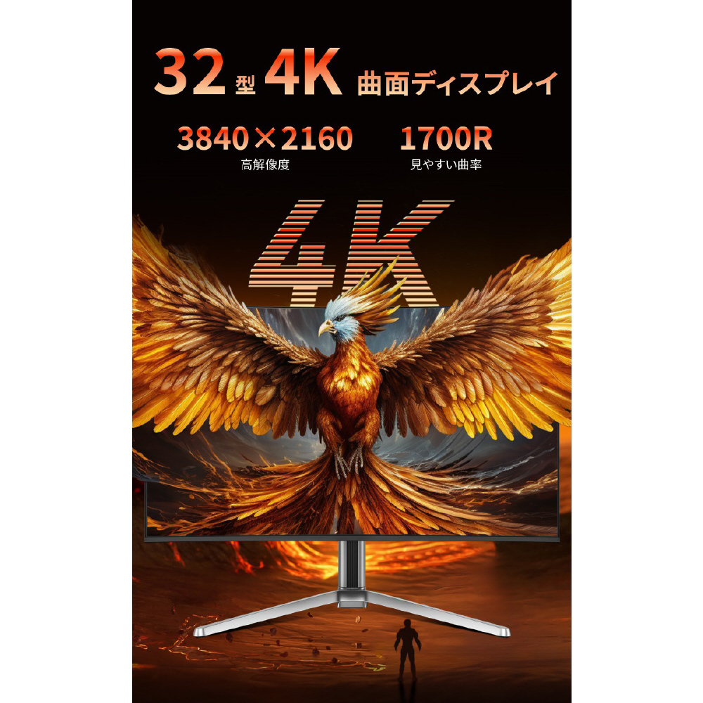 32型、4Kの大画面高精細なパネルと1700Rの緩やかな曲面で、ワイドなフルスクリーンの映像を大迫力で楽しめます。