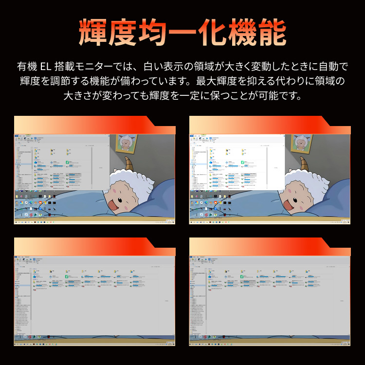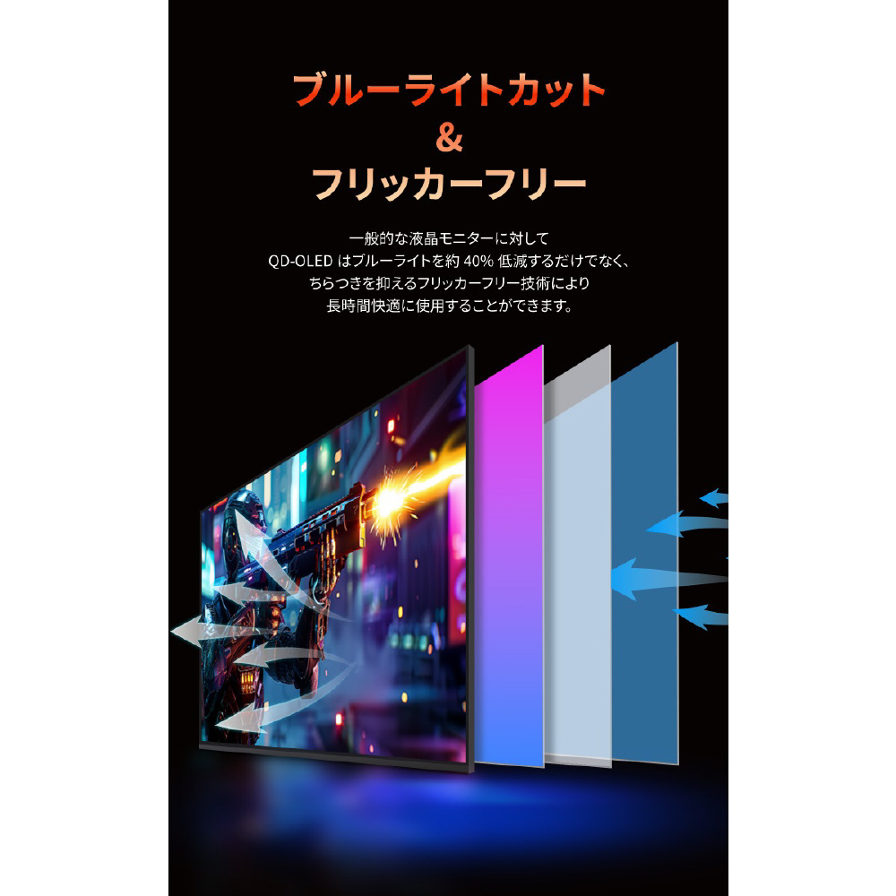 QD-OLED(量子ドット有機EL)により、目の疲れの原因となるフリッカー(ちらつき)を低減します。さらにブルーライトカット機能も搭載し、長時間の使用でも目の負担を軽減することが可能です。