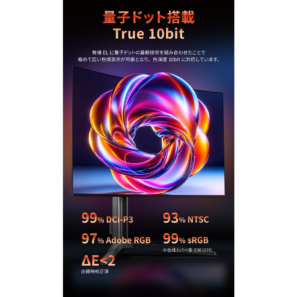 量子ドット技術により従来のモニターでは弱点だった緑や赤の発色を改良し、DCI-P3 99%、Adobe RGB 97%の広色域に対応します。工場出荷時に各個体へキャリブレーションを実施し、デルタE<2となる誤差の少ない正しい色を映します。