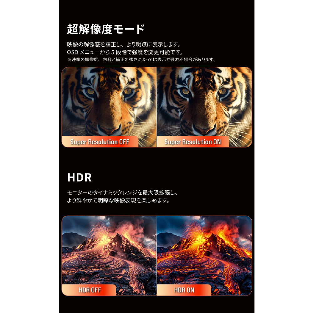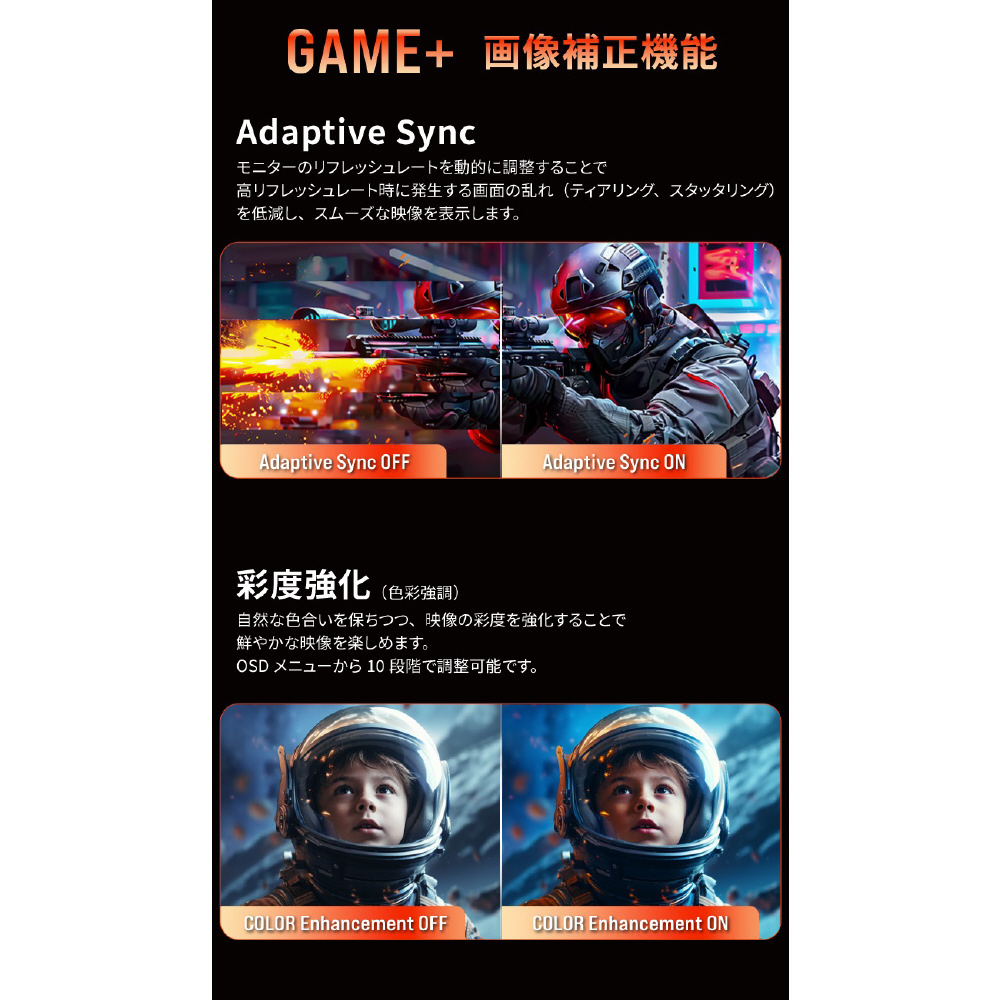 240Hzという高いリフレッシュレートで、なめらかでダイナミックなゲーム体験を楽しめます。AdaptiveSyncにより動的にリフレッシュレートを変動させ、スタッタリングやティアリングといった表示の乱れを軽減し、映像に集中することができます。