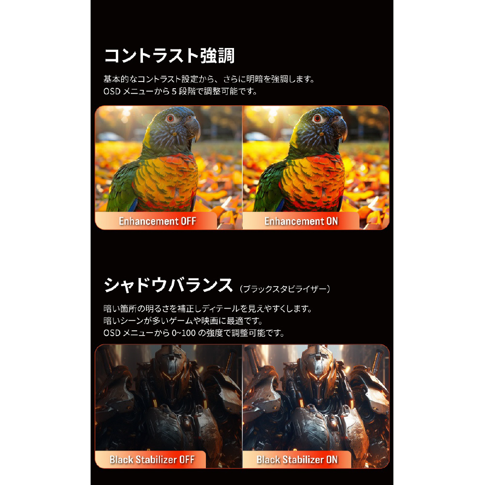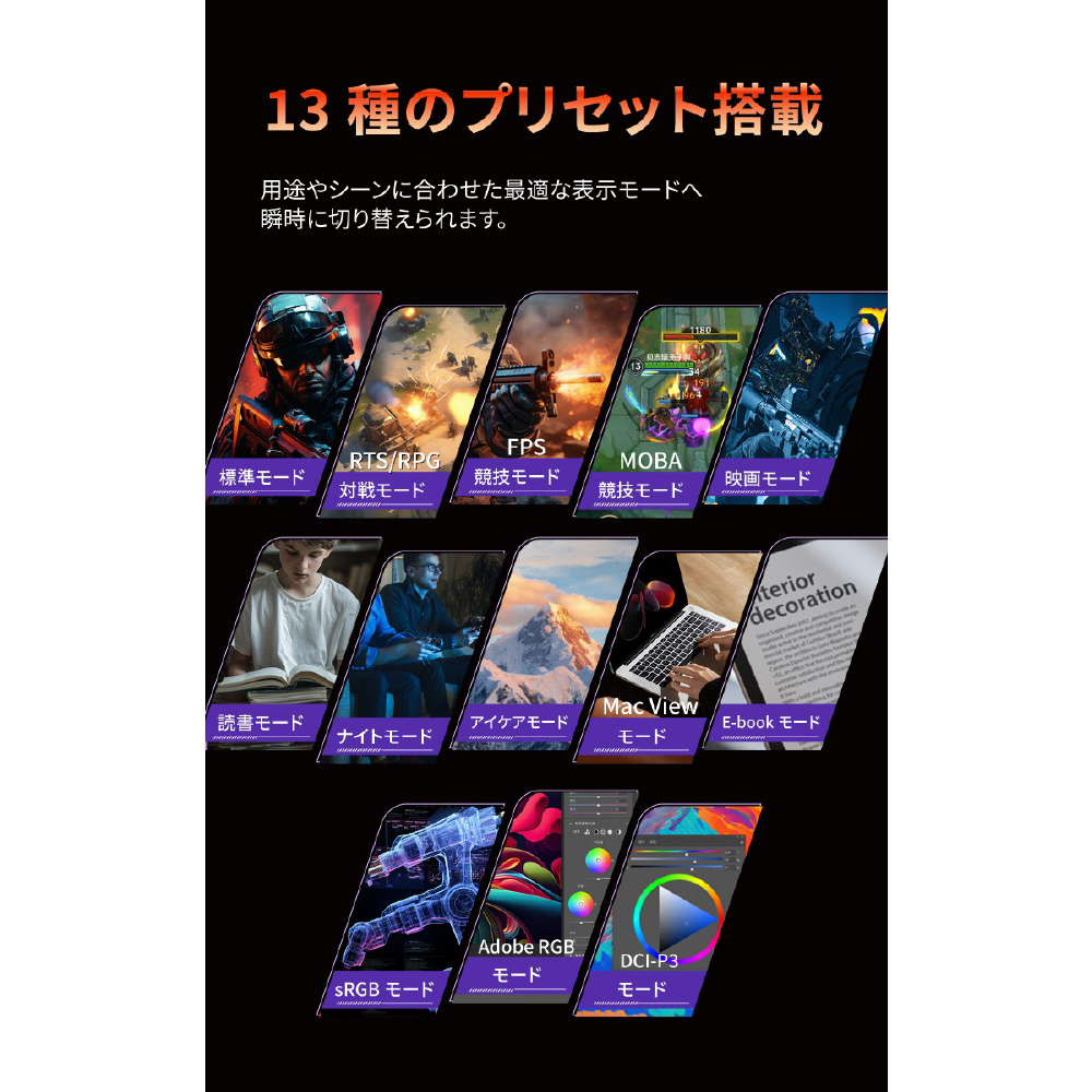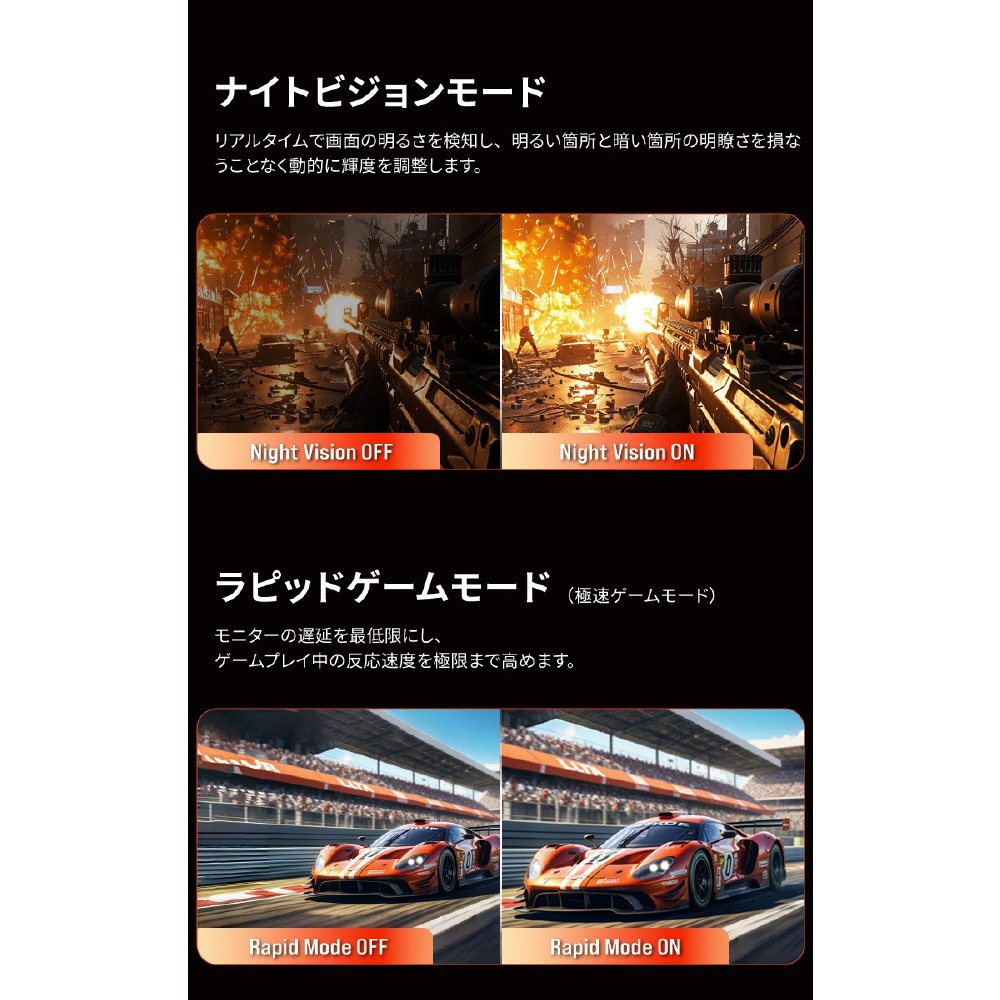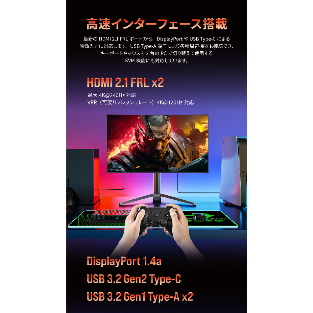 PlayStation5やXBOX series Xなど最新の家庭用ゲーム機でVRR(可変リフレッシュレート機能)にも対応しティアリングやスタッタリングを軽減します。さらに、2台のPCを1セットのマウス・キーボードで切り替えて使用するKVM機能にも対応しています。