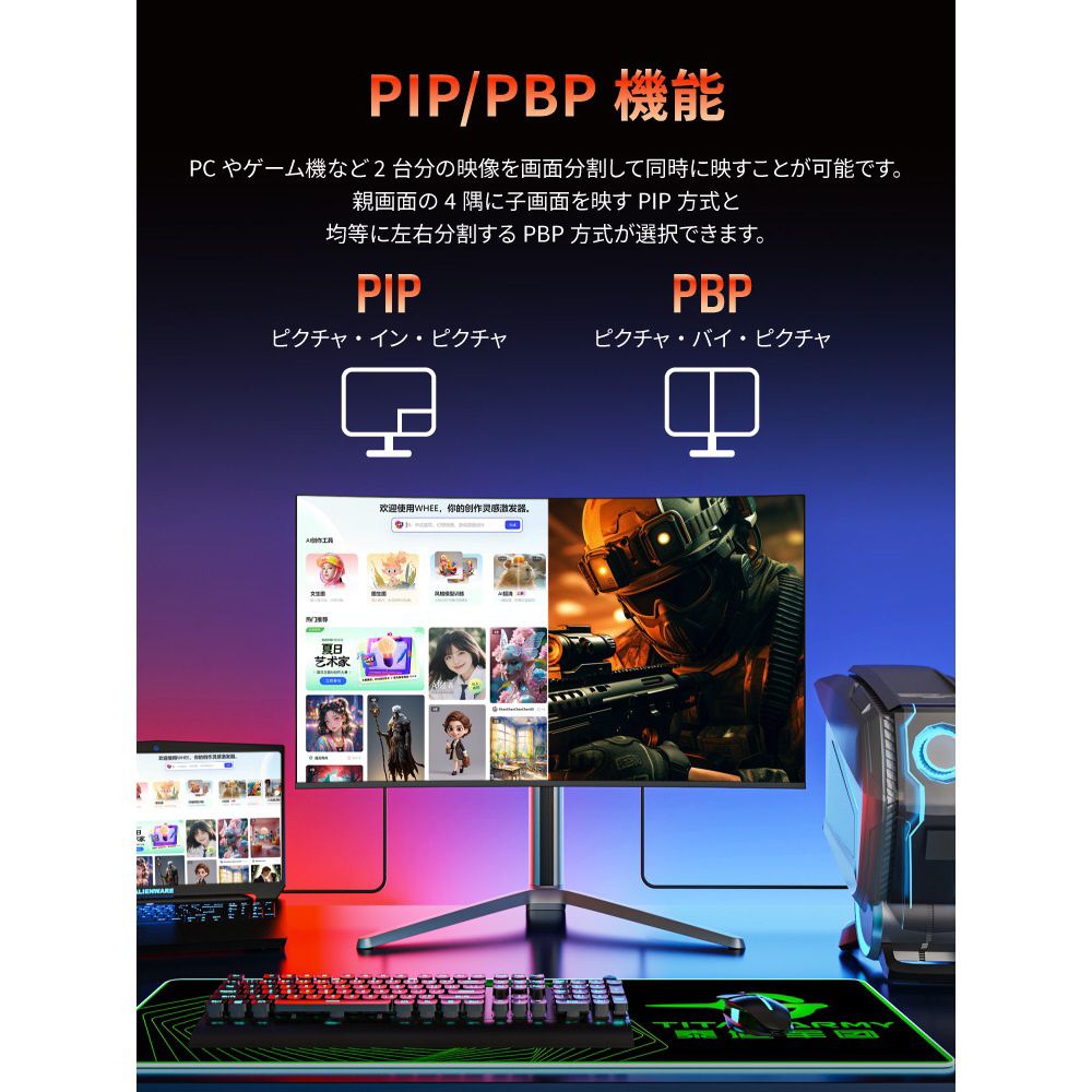 2台のPCやゲーム機を分割表示するPBP/PIP方式に対応しています。ディスプレイポートを1つ、HDMI 2.1ポートを2つ搭載し複数の機器を切り替えて使用することができます。